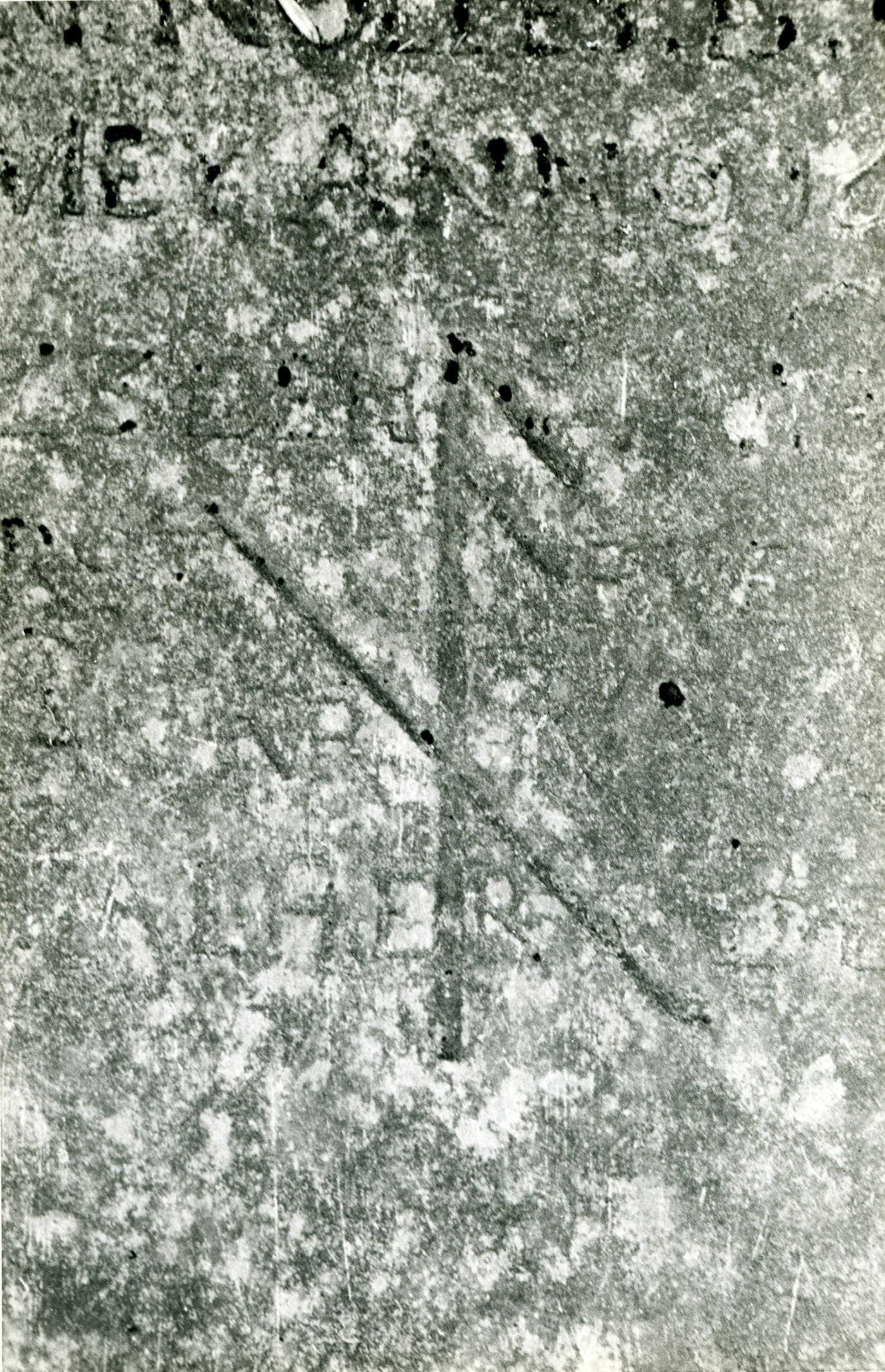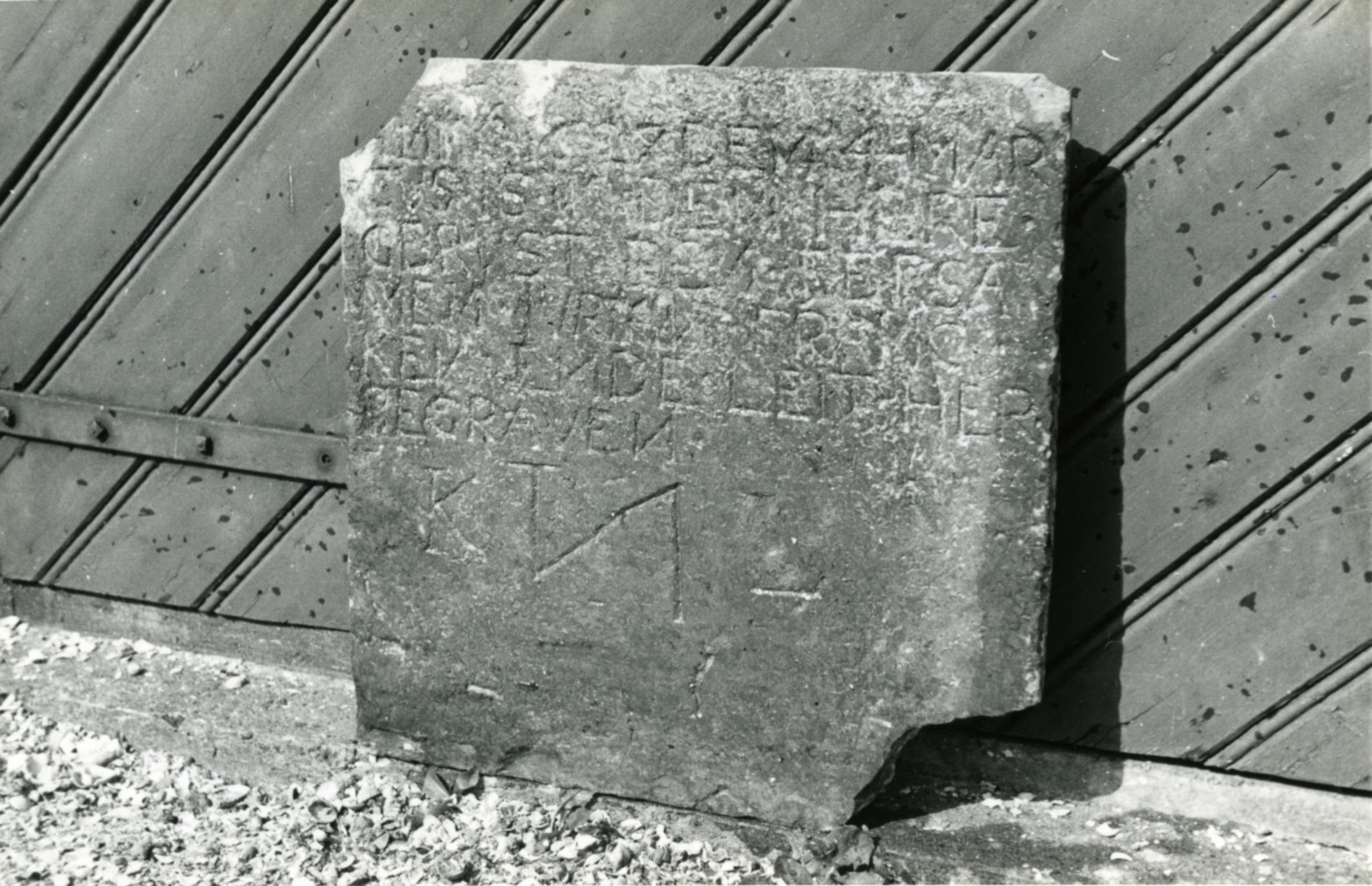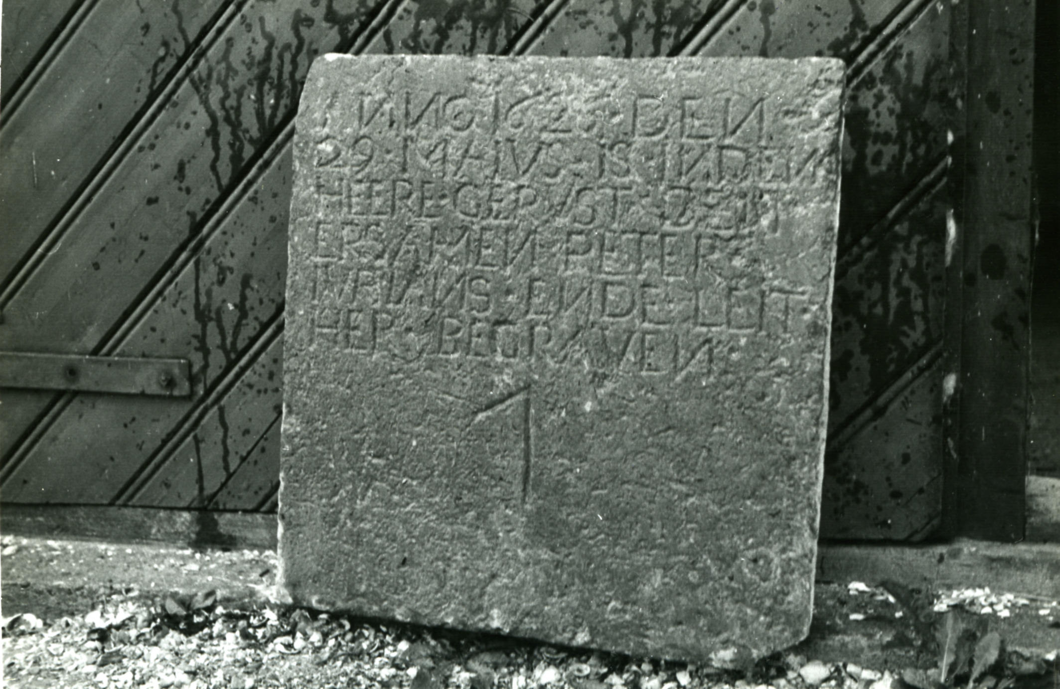 Grafsteen uit 1632, Spanga, 1944 (zwart-wit foto)