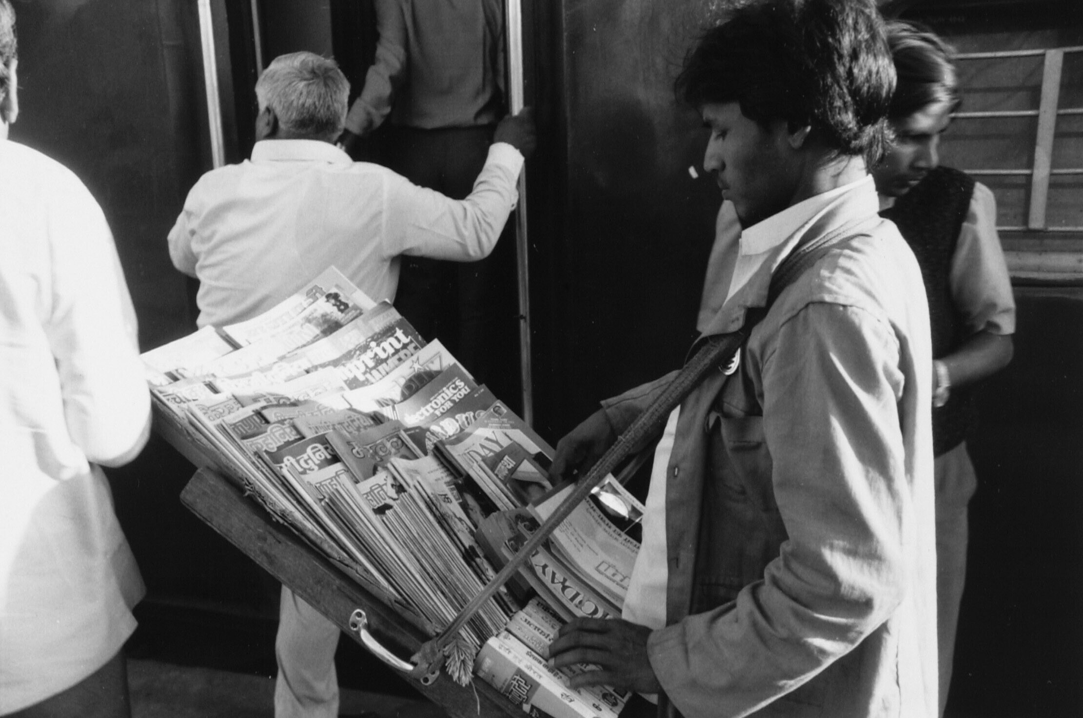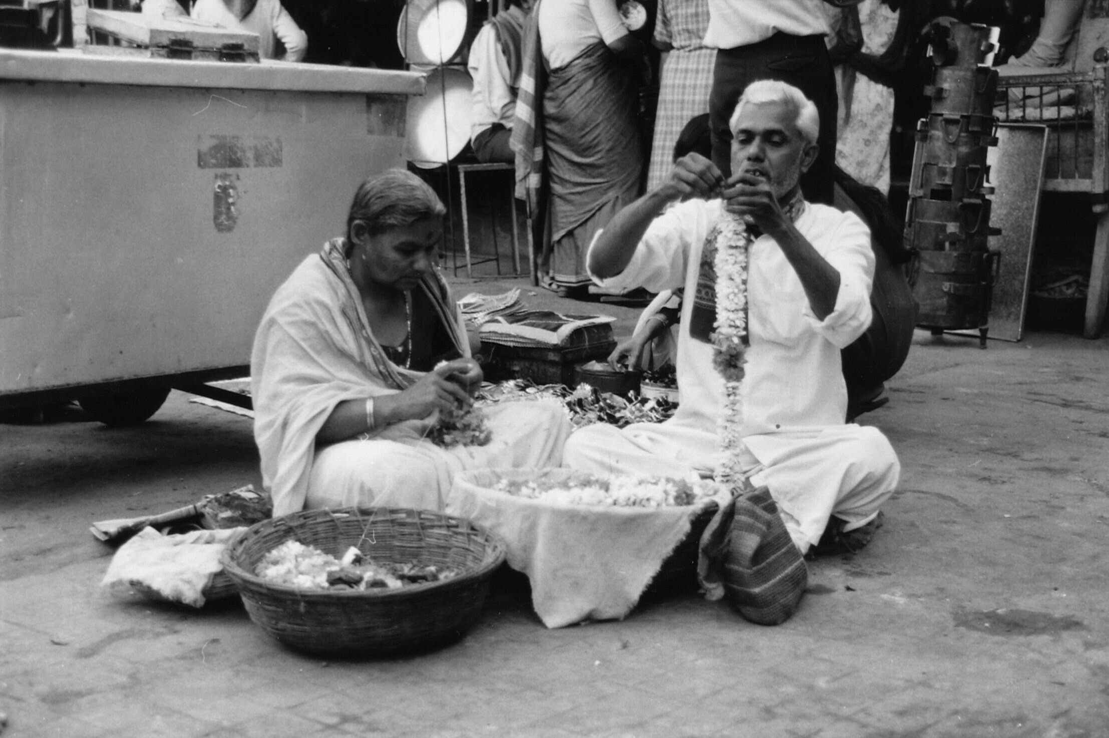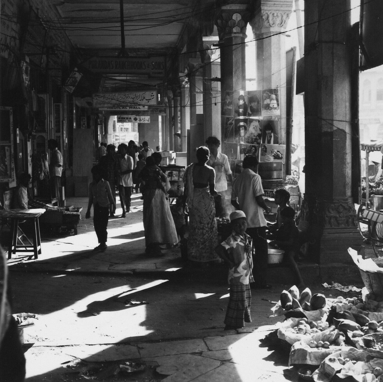 Straatbeeld met op de voorgrond een fruitverkoper me...