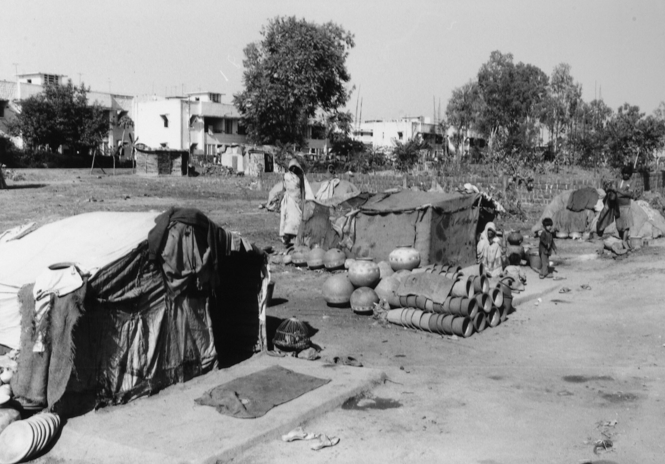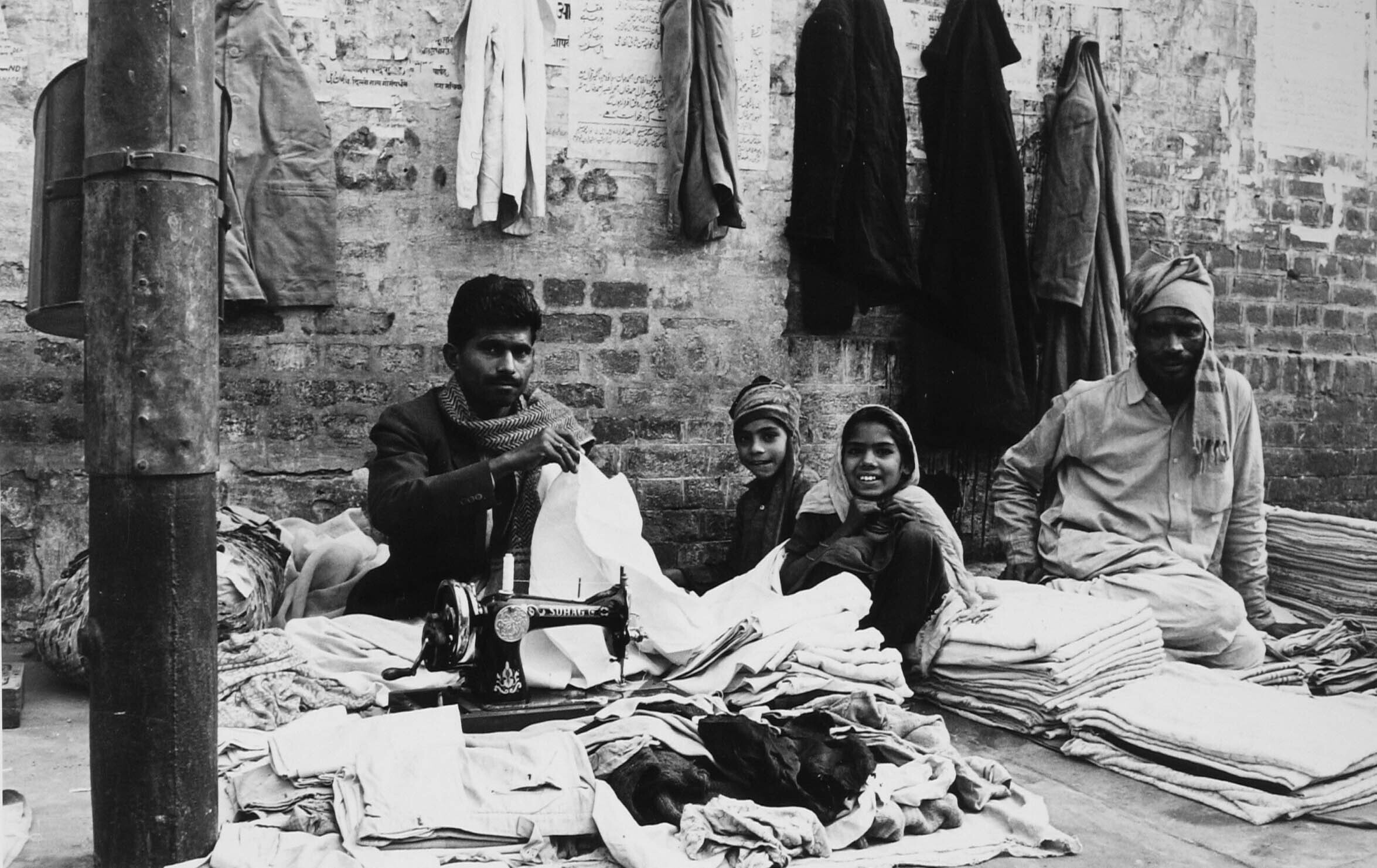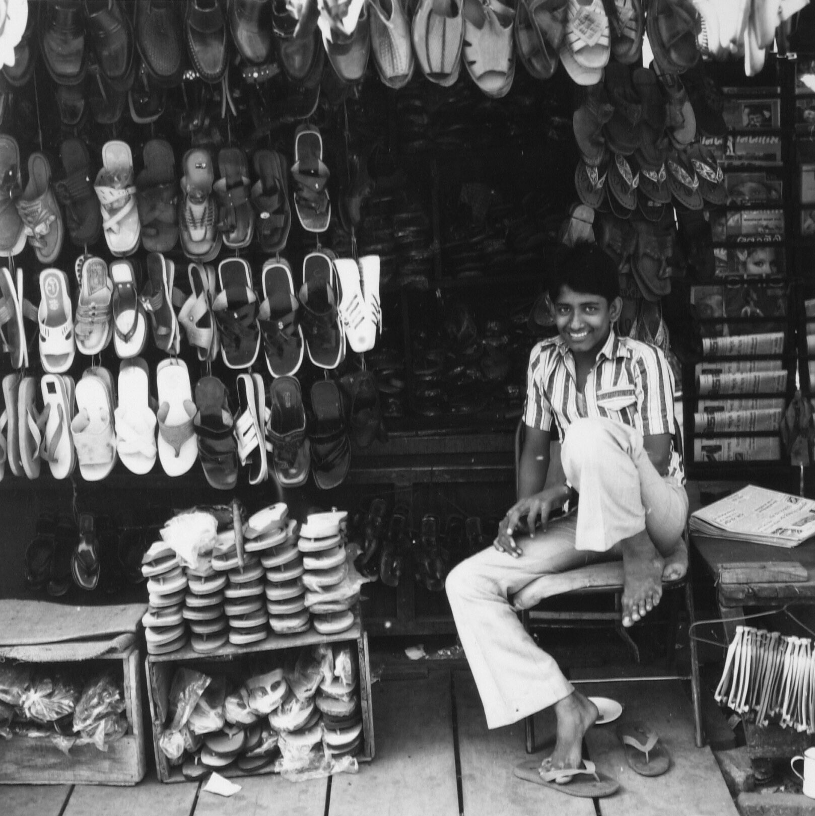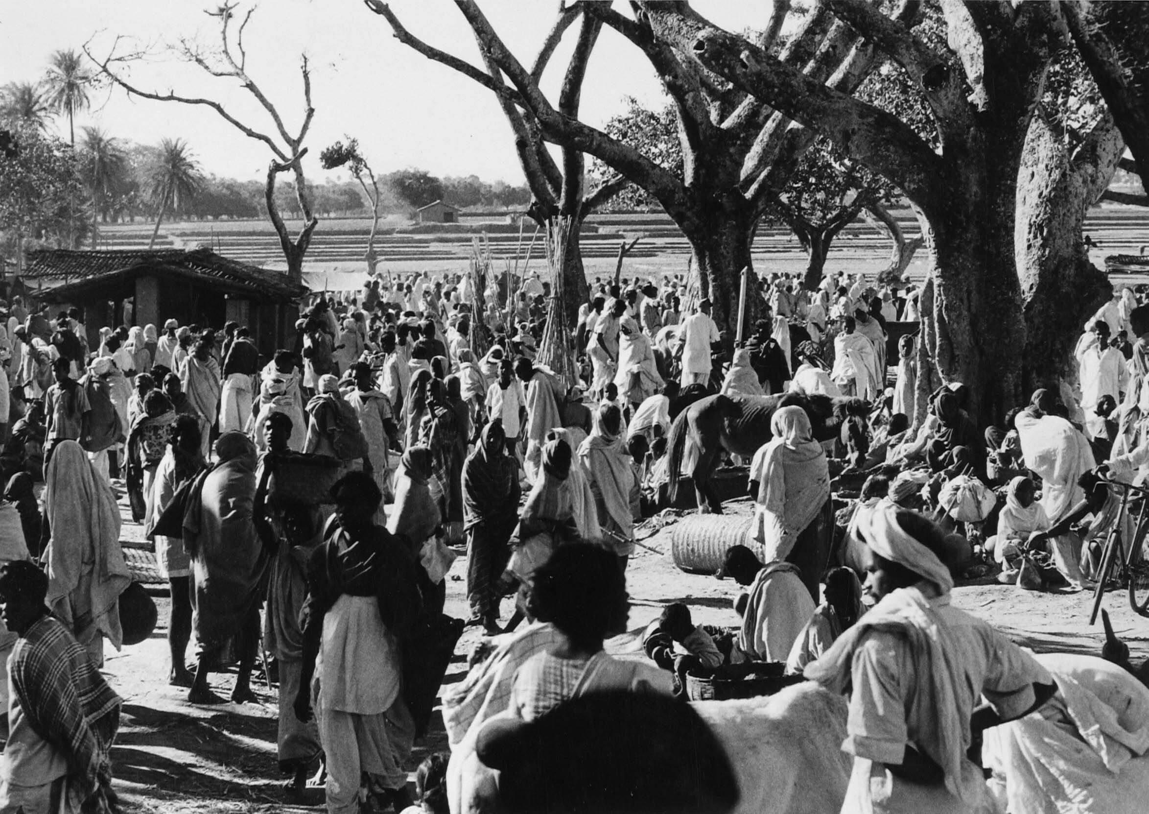 Straatbeeld met op de voorgrond een fruitverkoper me...