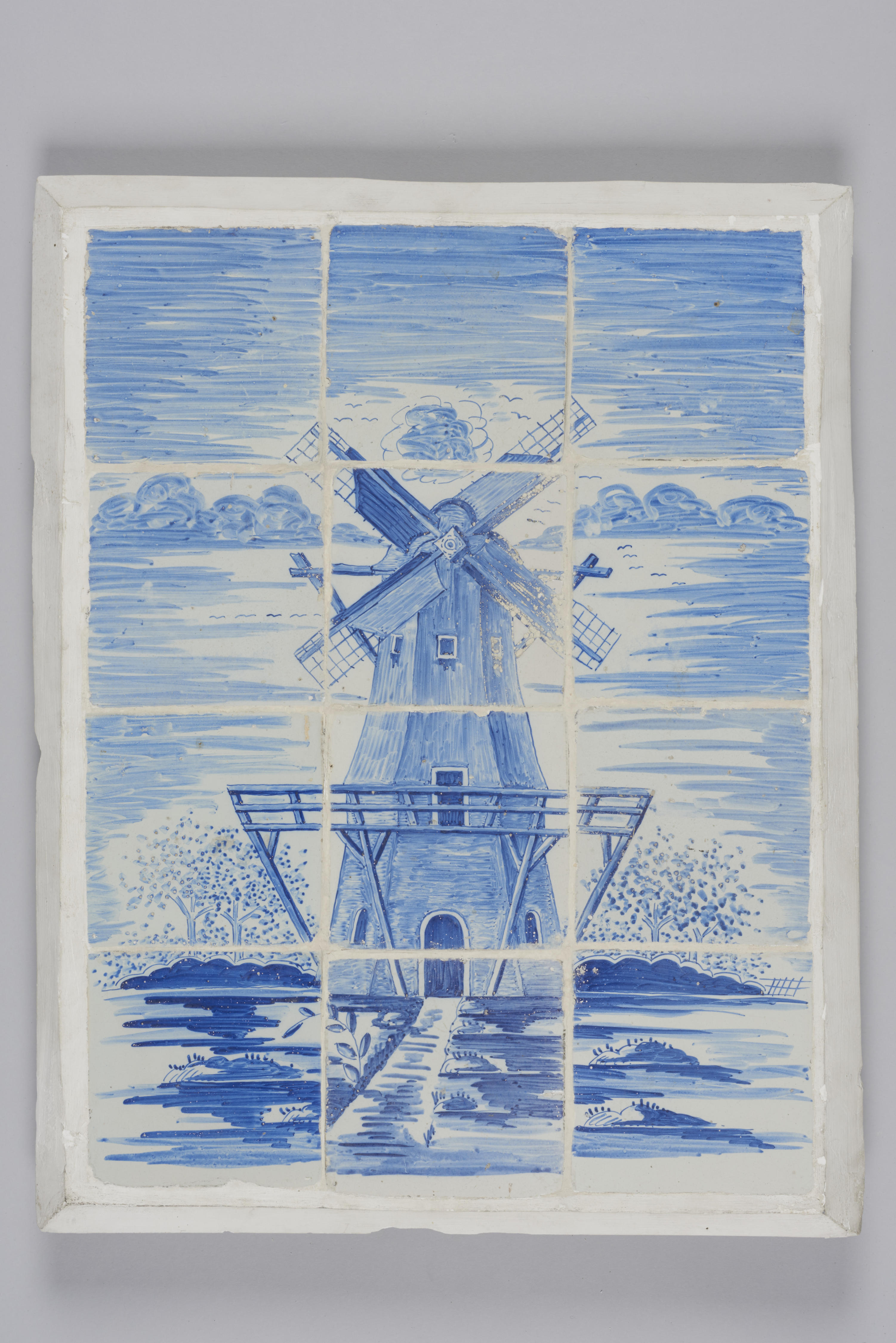 Tegeltableau van een landschap met stellingmolen, 18...
