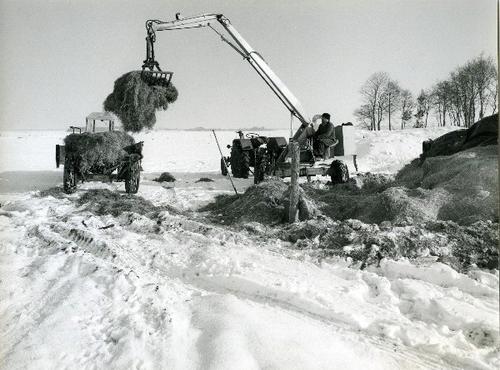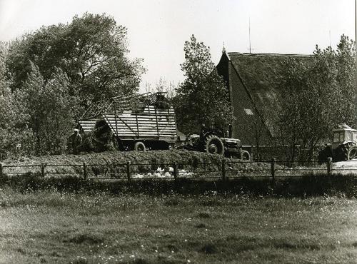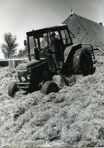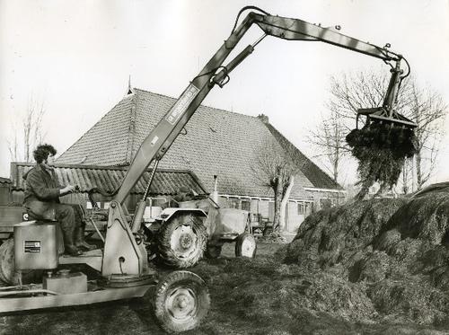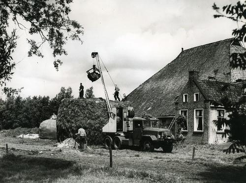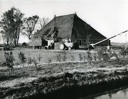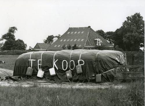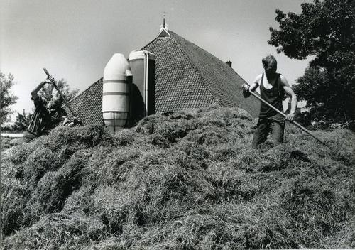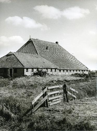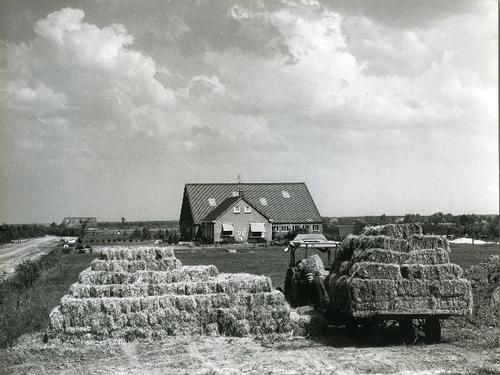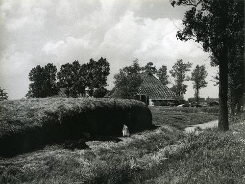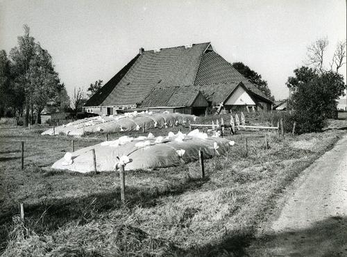Foto in zwart-wit van een stelpboerderij met kuilbul...