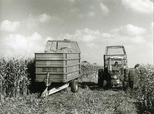 Foto in zwart-wit van de maisoogst door Johan Wittev...