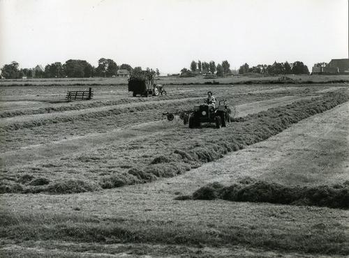 Foto in zwart-wit van het laden van gras op een rond...