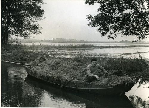 Foto in zwart-wit van een met gras beladen praam doo...