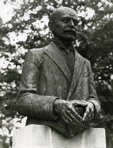 Foto in zwart-wit van het standbeeld van Th. M. Th. ...
