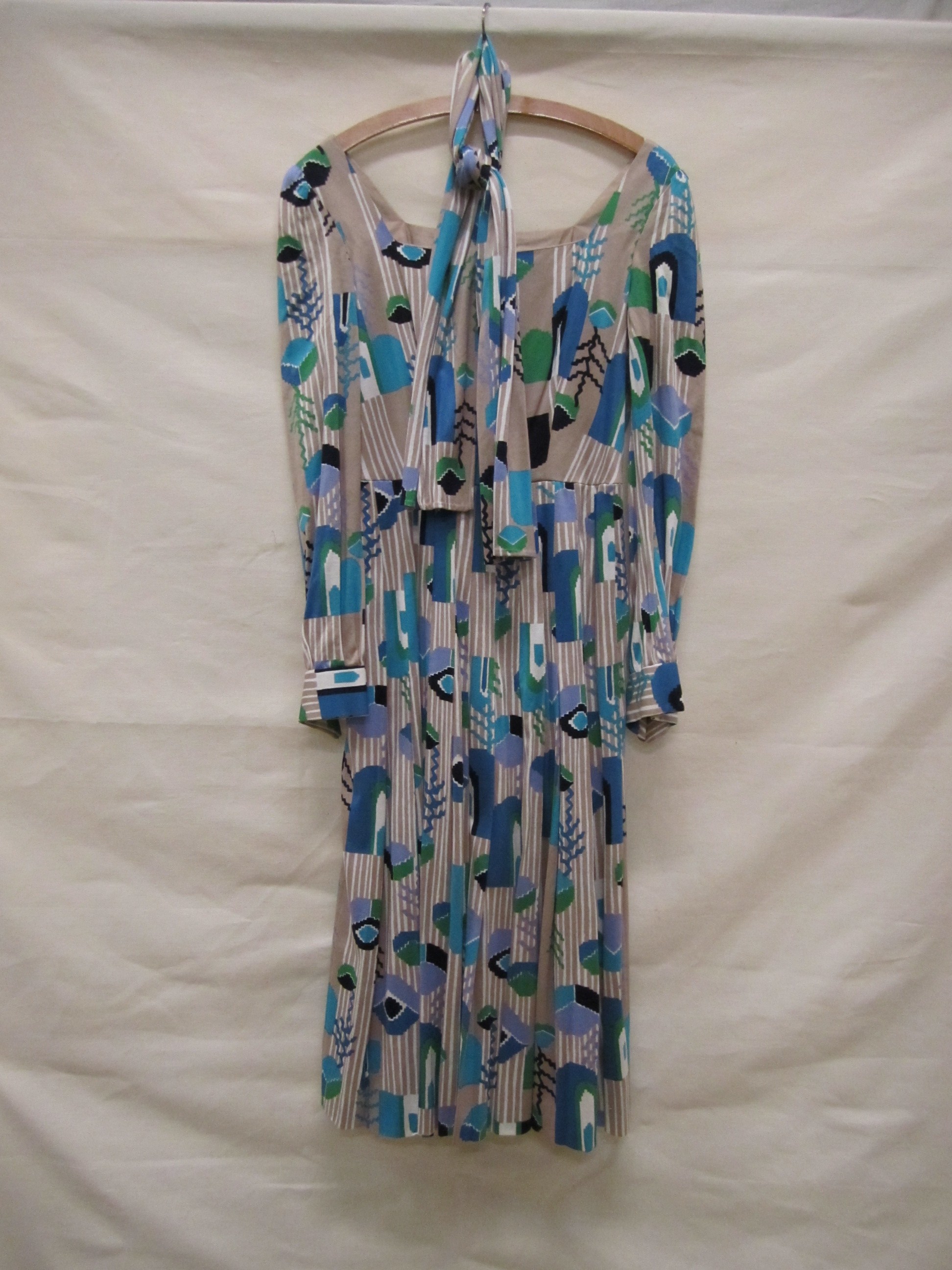 Jurk van zijde, bedrukt in donkerblauw met crèmekleu...