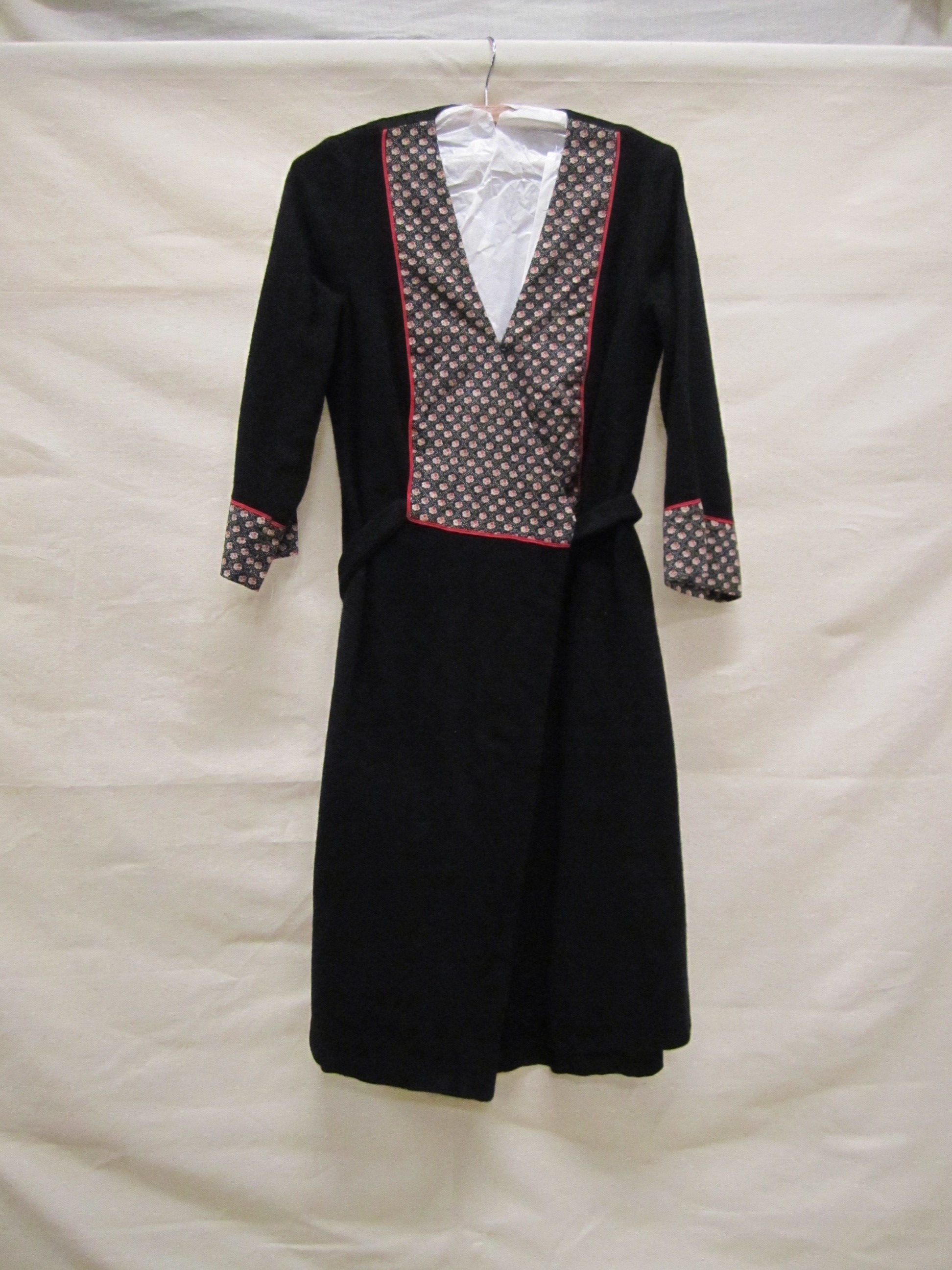 Peignoir/overslagjurk van zwarte wol en bedrukt kato...