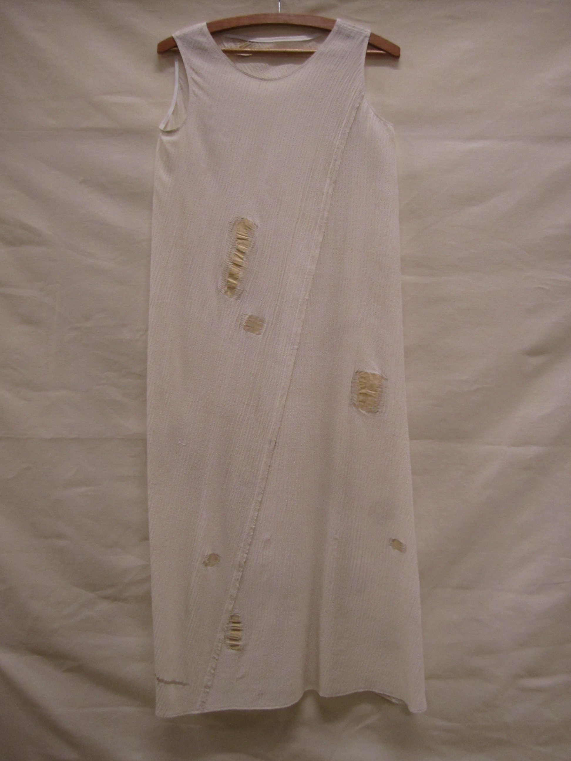 Jurk, witte katoen en zijde, hemdmodel van 2 schuine...