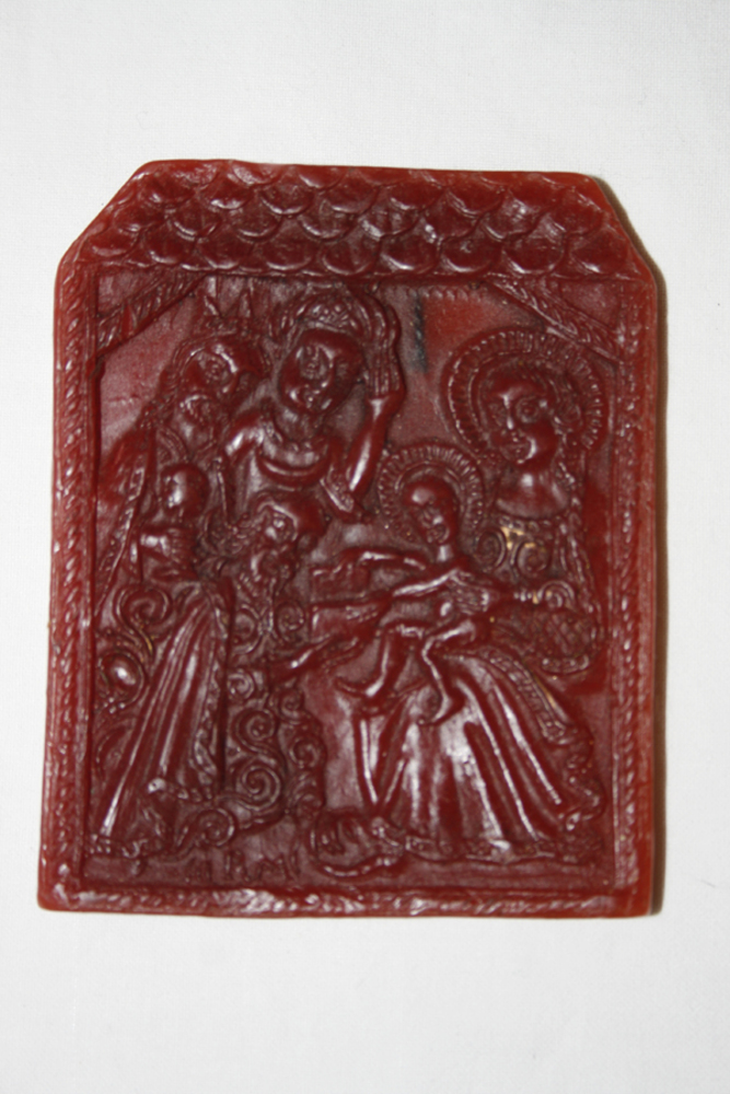 Plaatje van was waarin in reliëf is afgebeeld: 'Drie...