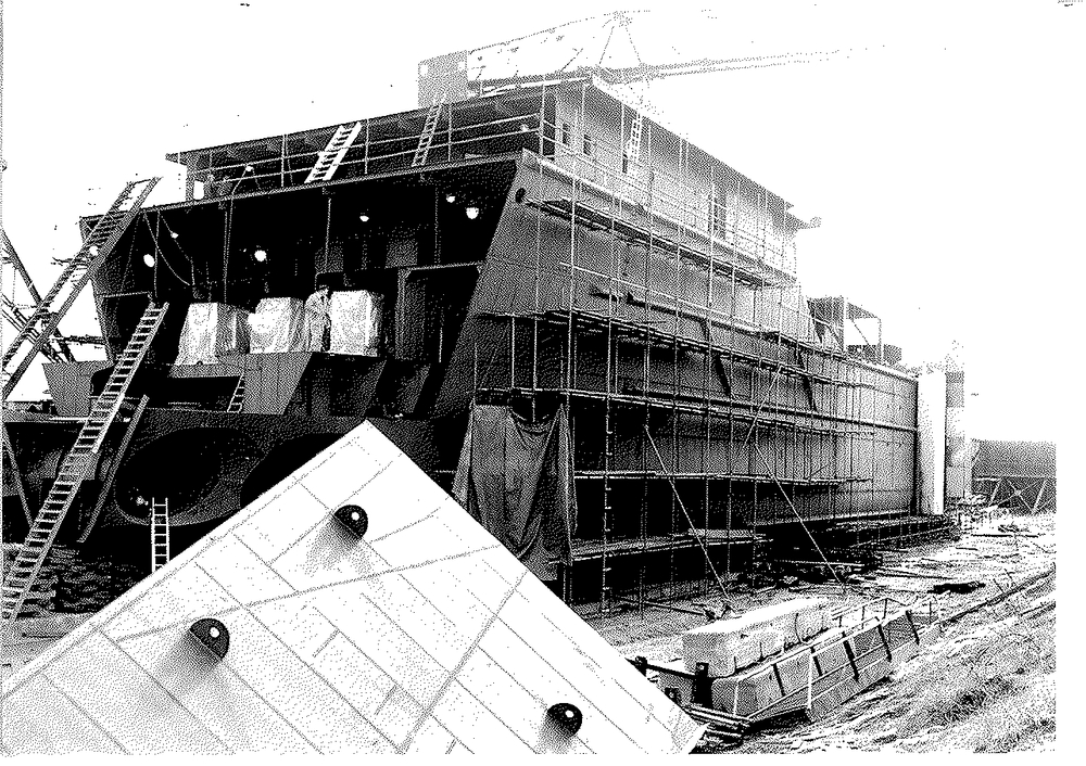 Zwart-wit foto van de bouw van een schip gebouwd doo...