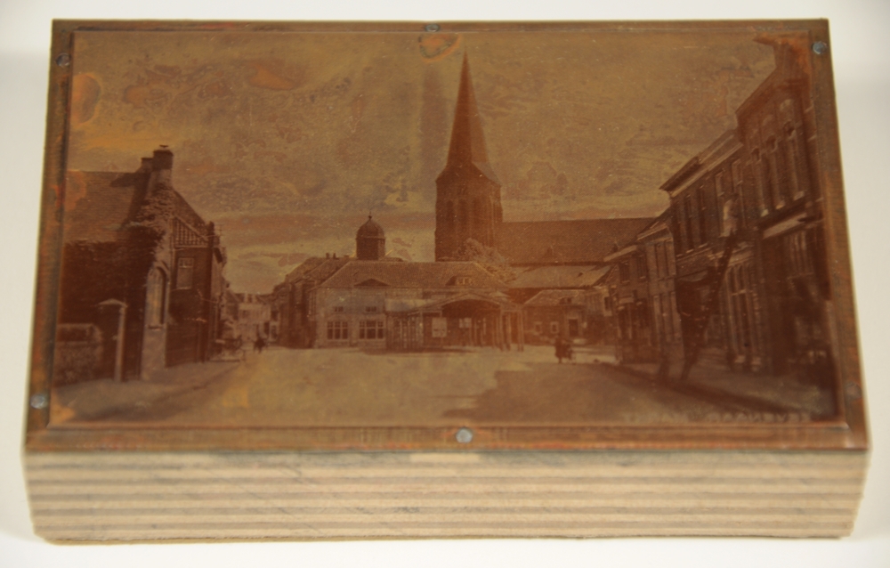 Cliché van koper op hout van een foto van de Markt i...