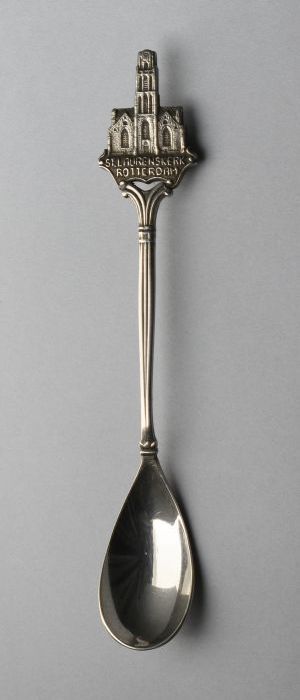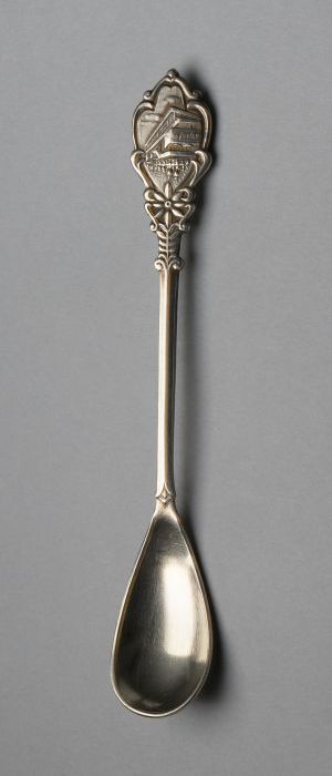 Verzilverd theelepeltje met afbeelding en opschrift ...