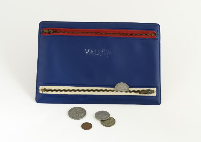 Rechthoekig, blauw reisetui met diverse muntjes uit ...