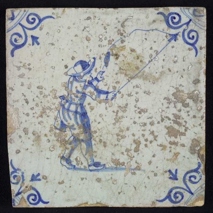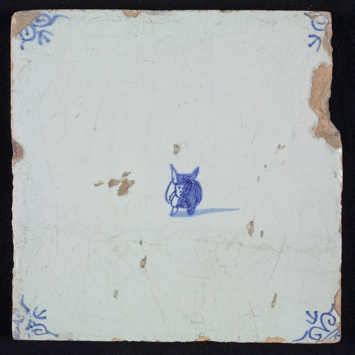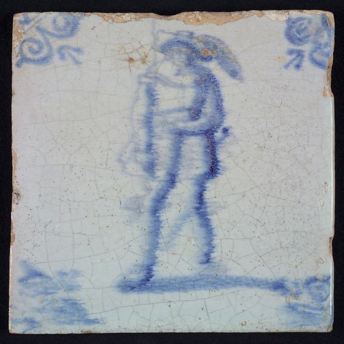 Figuurtegel, soldaat, blauw decor op wit fond, hoekm...
