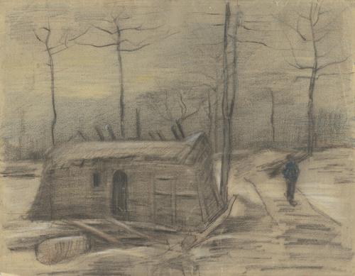 Winterlandschap met keet en figuur