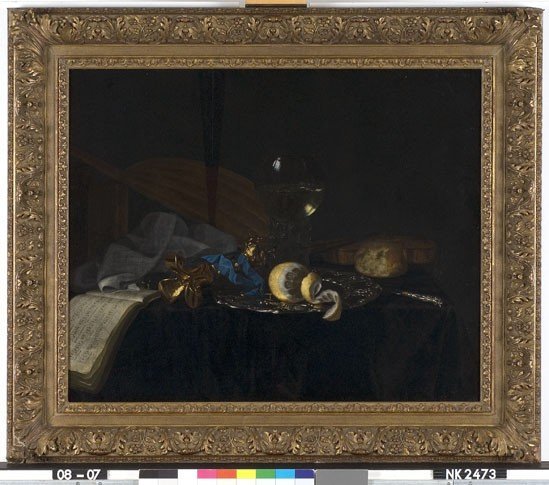 Stilleven met roemer, glasstandaard en muziekinstrum...