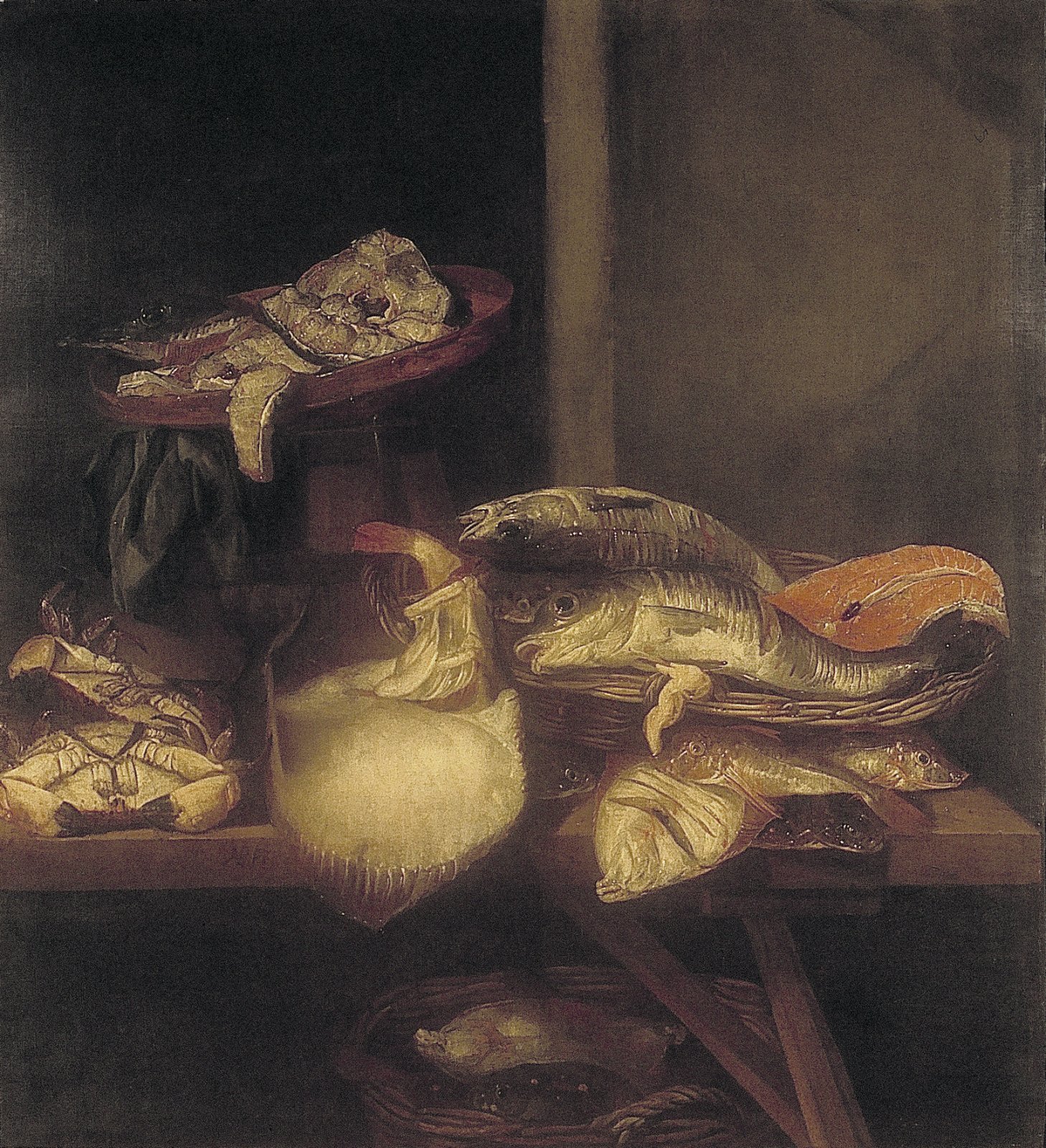 Stilleven met vis op schragentafel