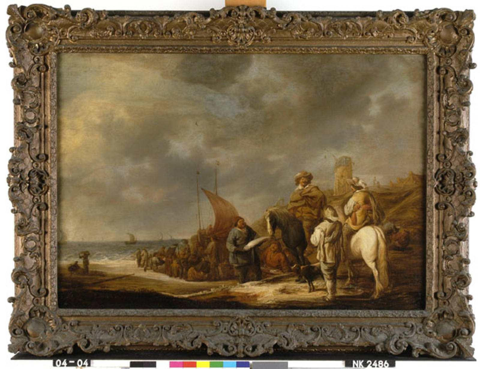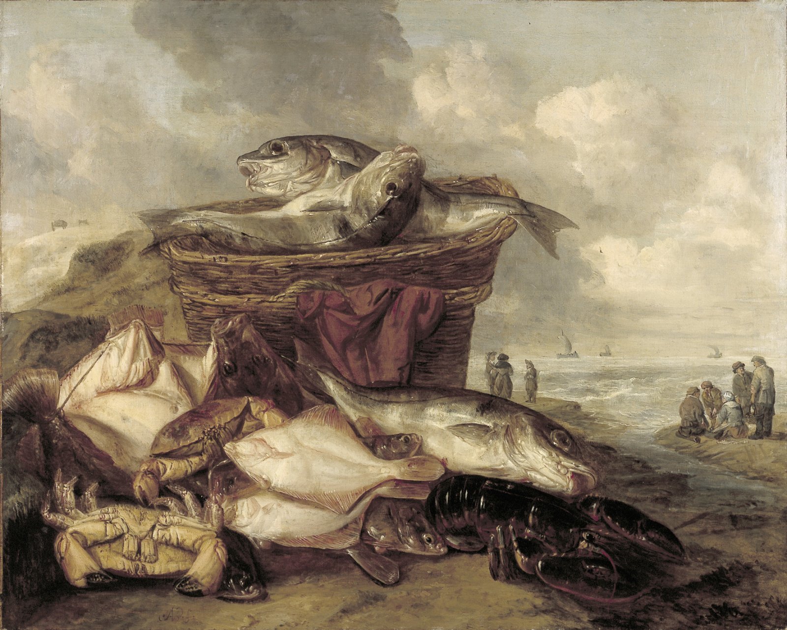 Stilleven met vis en twee manden op het strand
