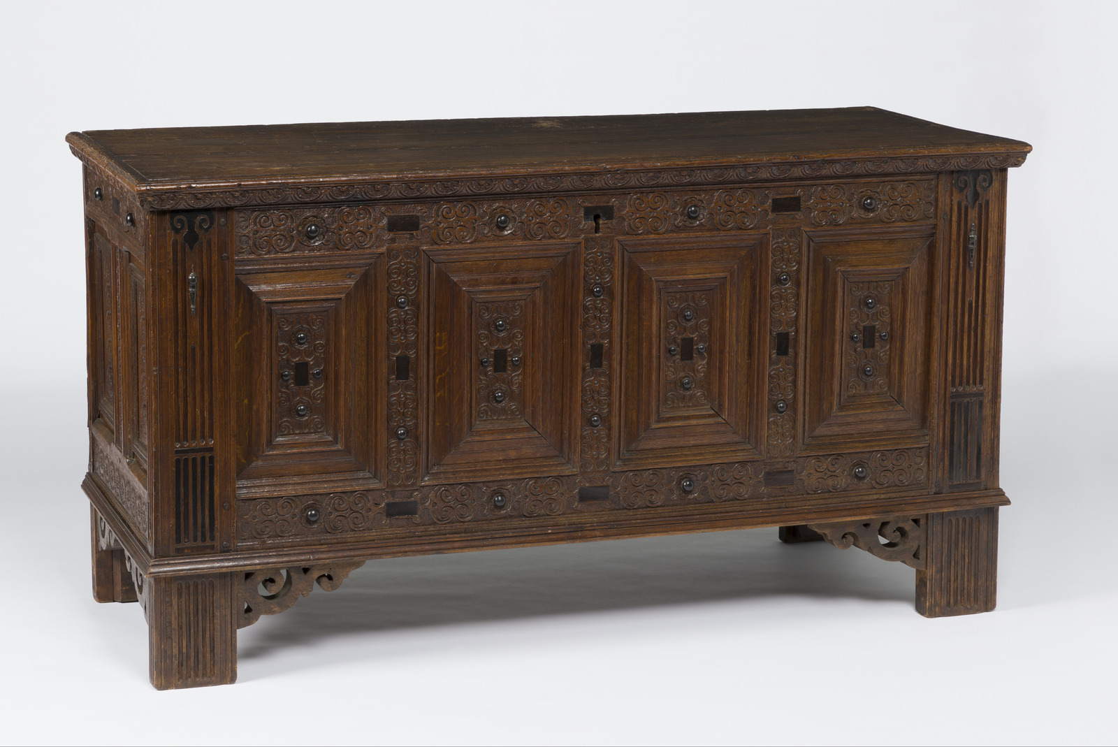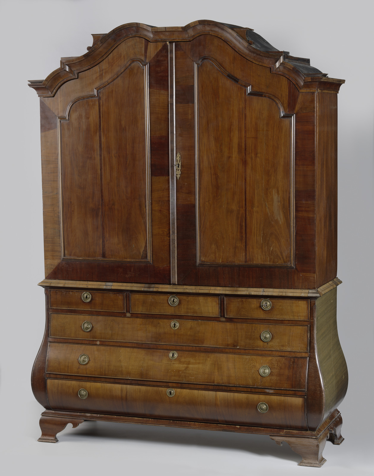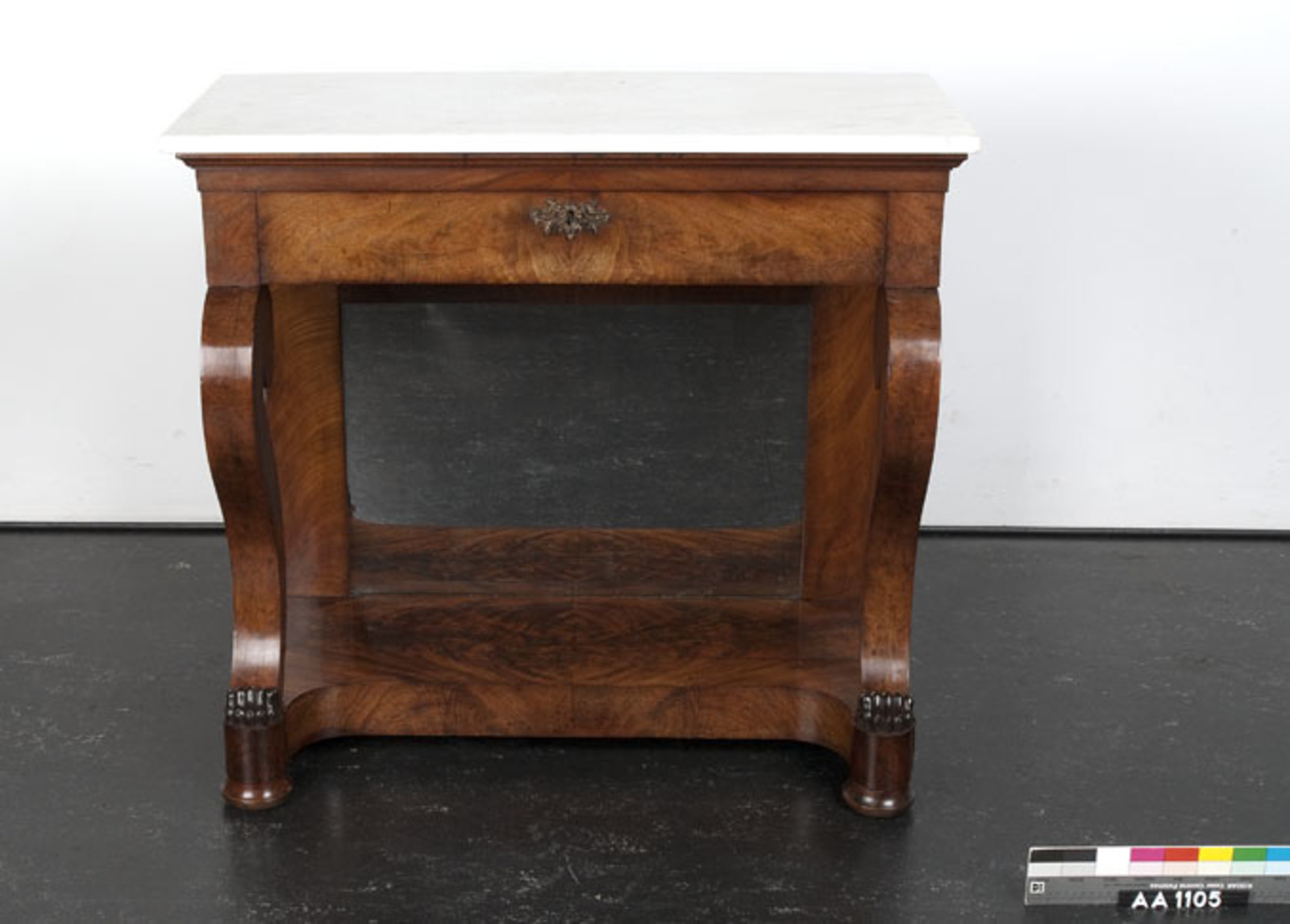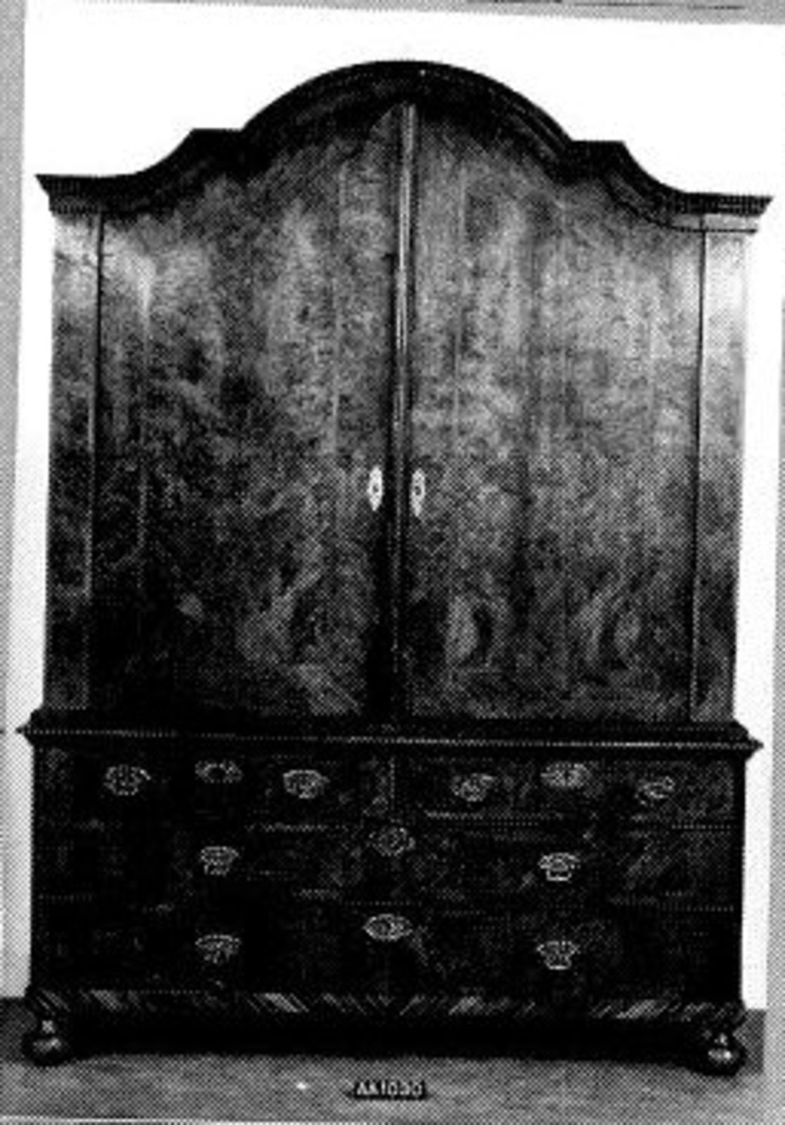 diverse houtsoorten belijmd met padoek- en cederhout, versierd met beschilderde wit marmeren plaquettes (1)