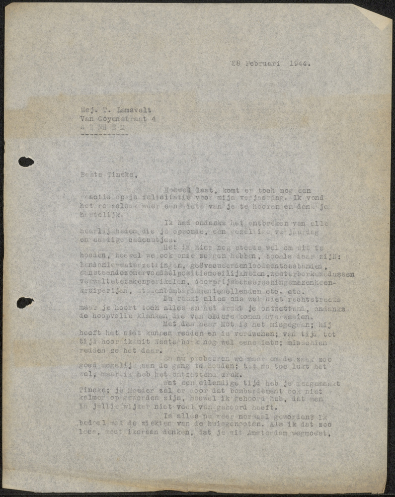 Brief aan Mej. Lamsvelt Arnhem 28 februari 1944