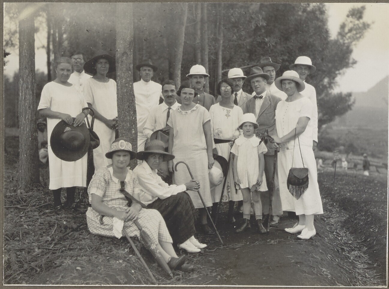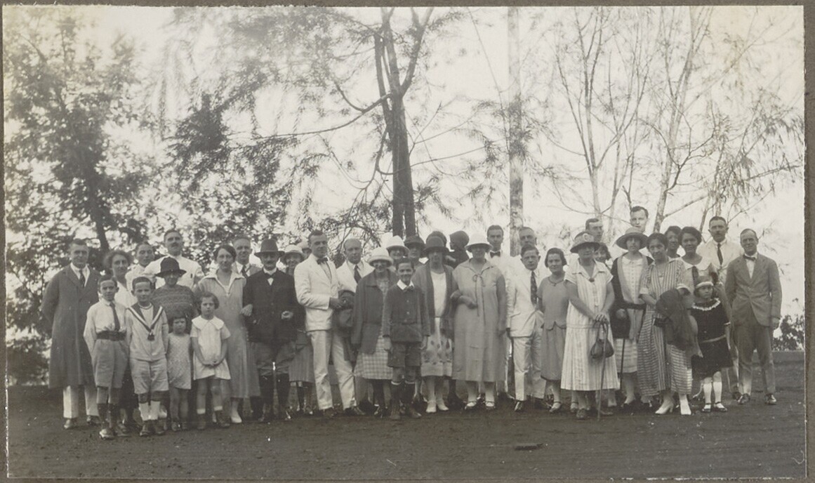 Portret van mannen, vrouwen en kinderen op een grasveld