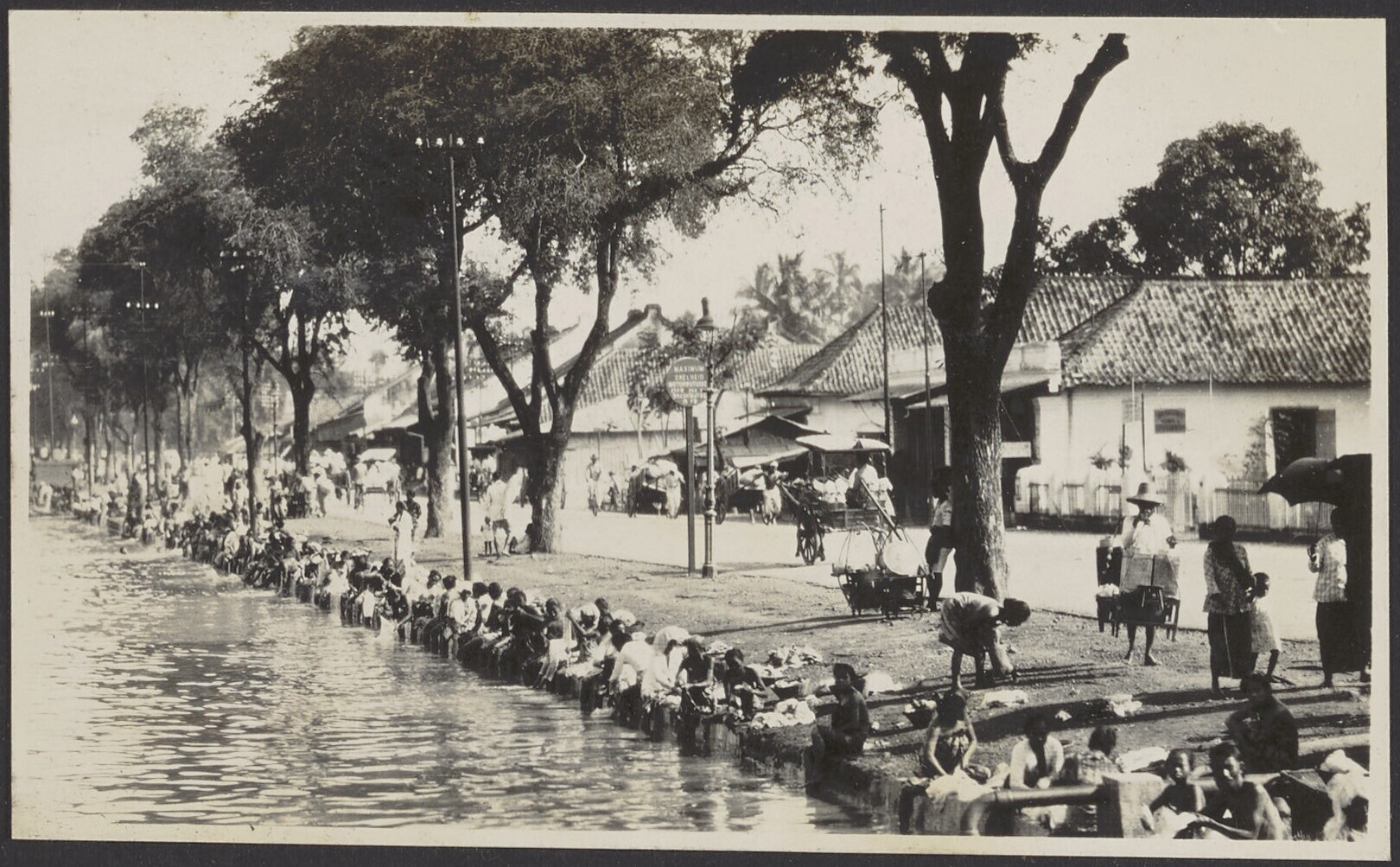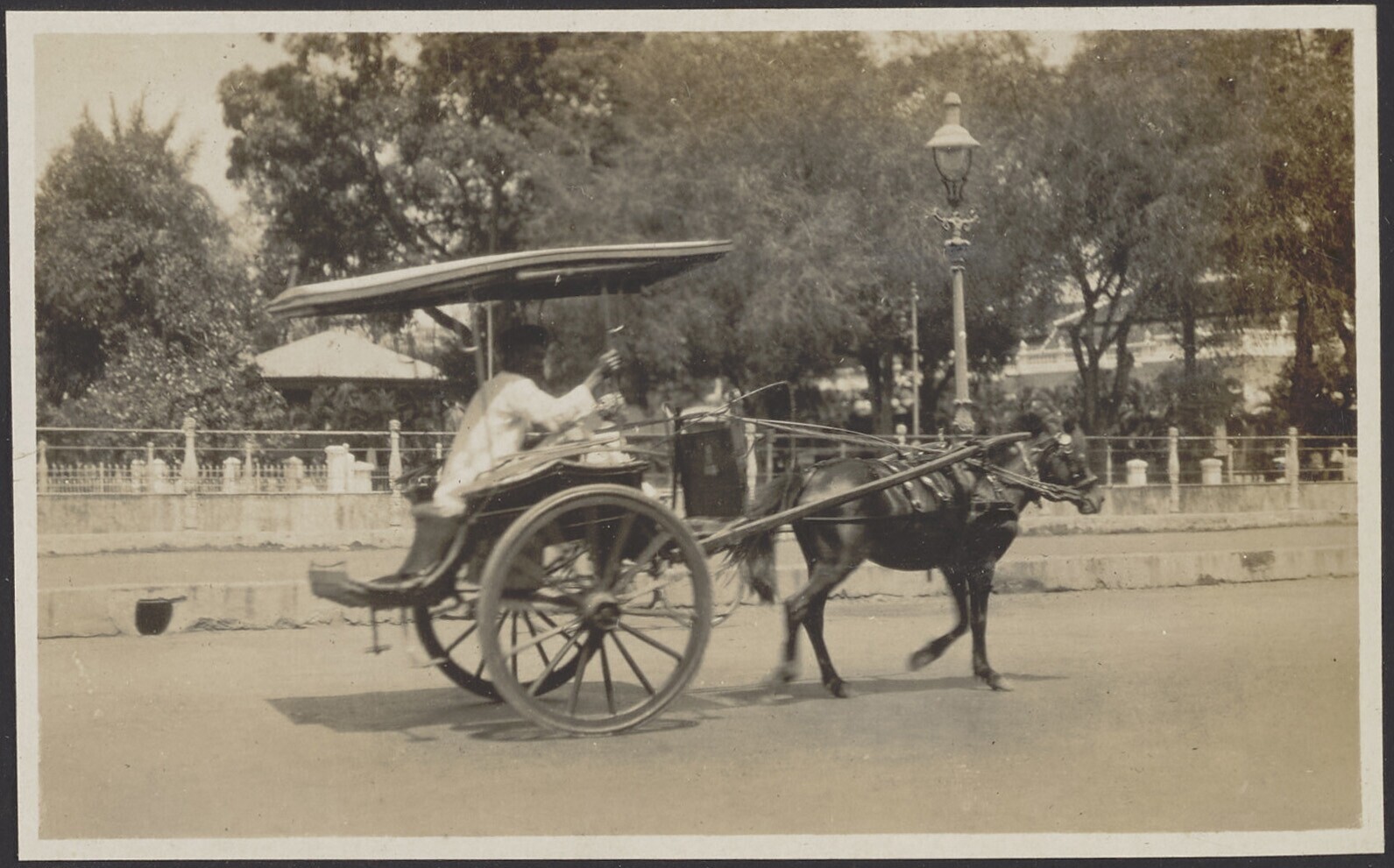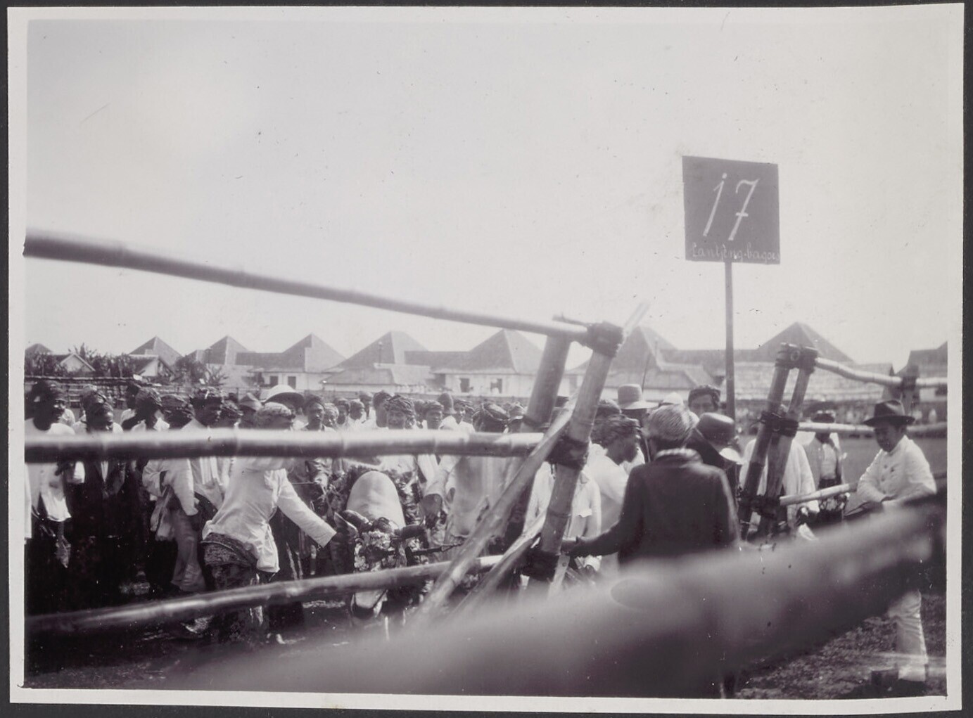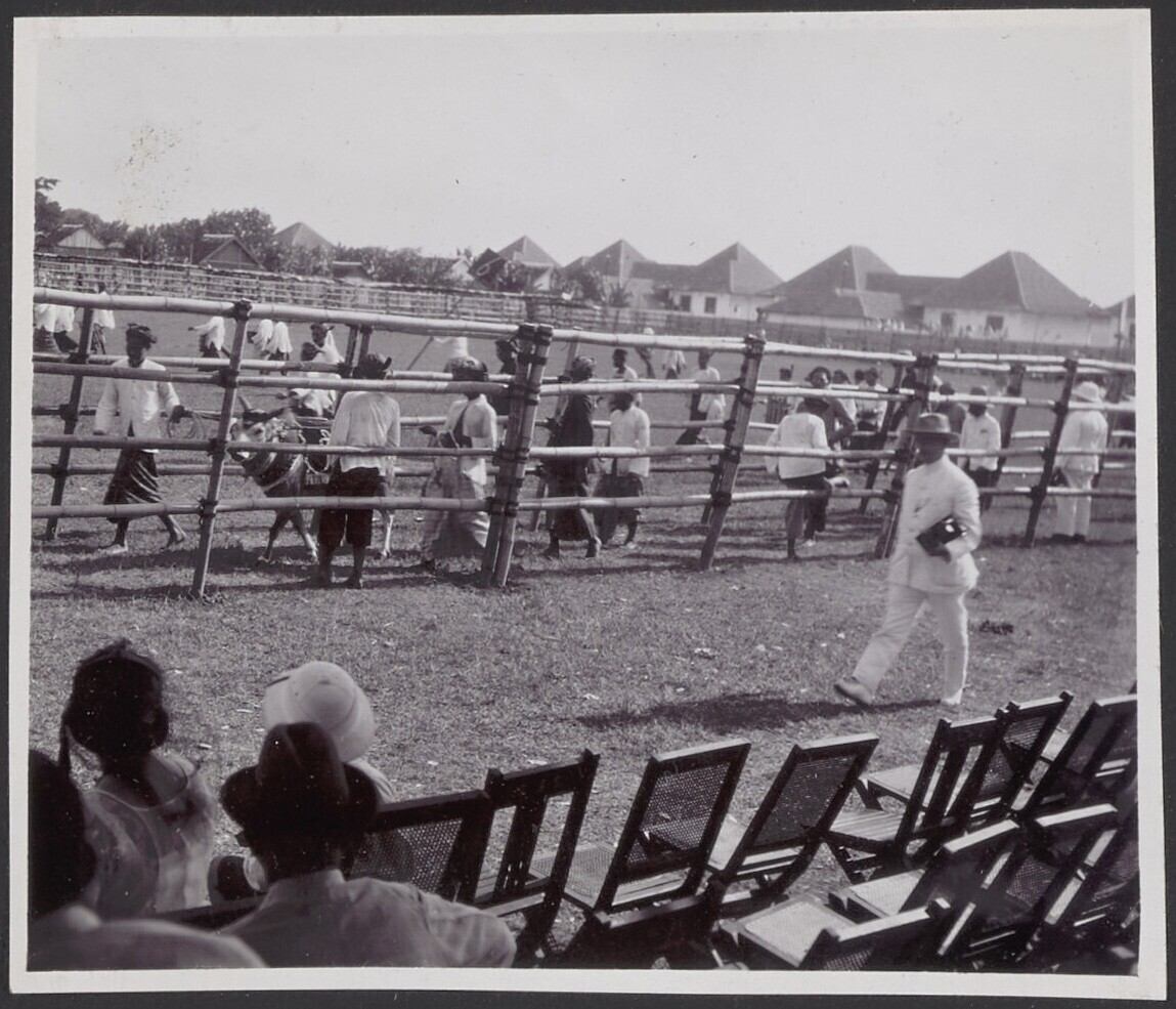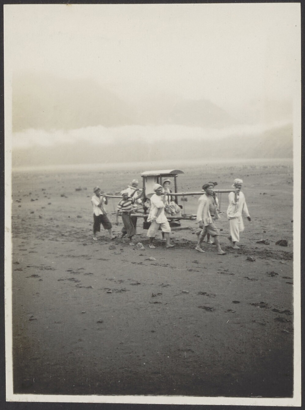 Europese vrouw in draagkoets, gedragen door acht Jav...