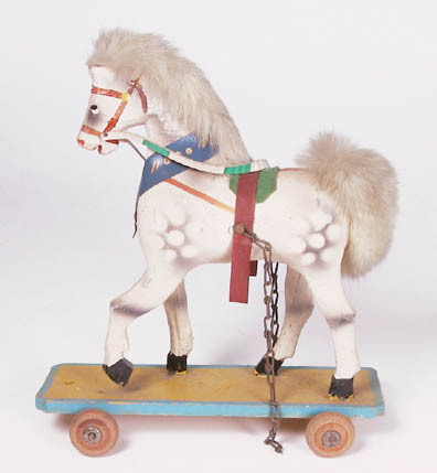 Twee paardjes van hout op wielen