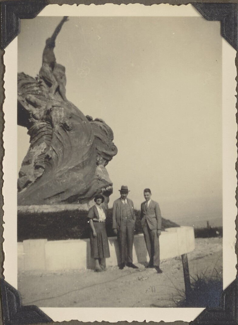 Portret van twee mannen en een vrouw bij een monument