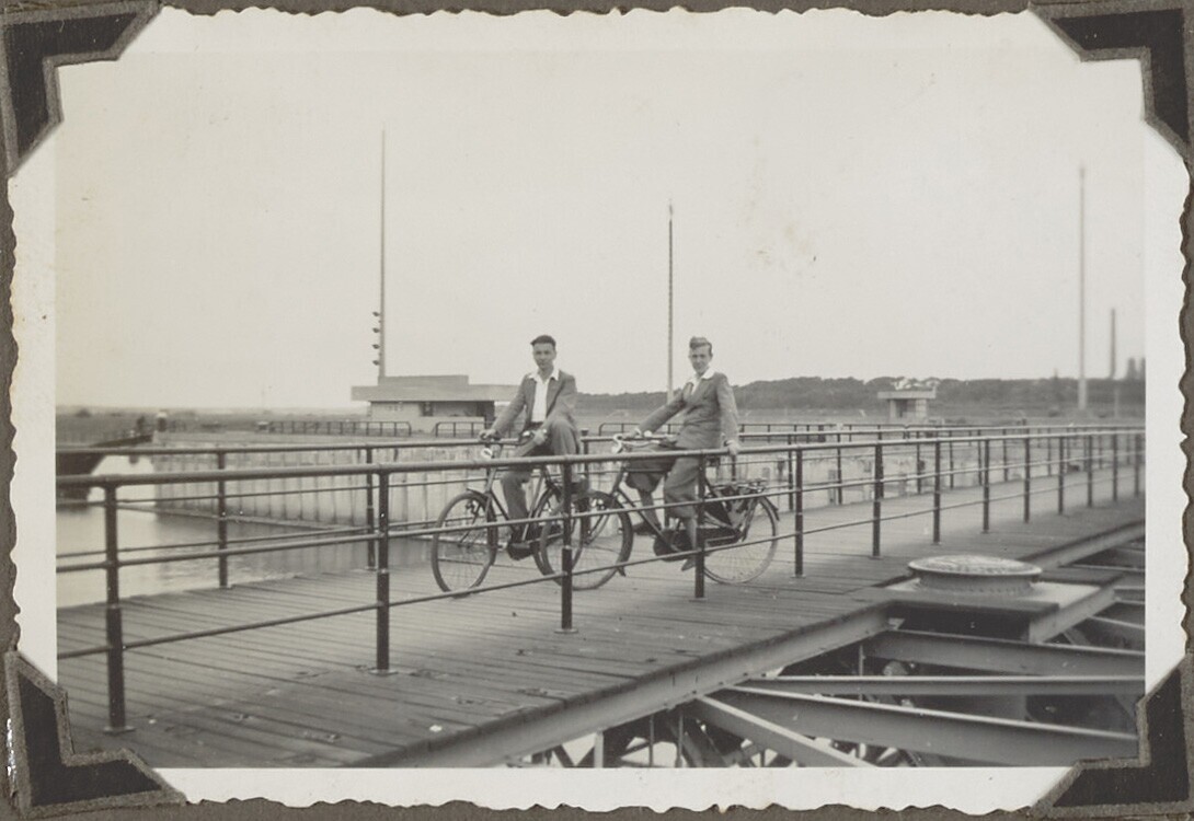 Portret van twee mannen op de fiets bij de sluizen v...