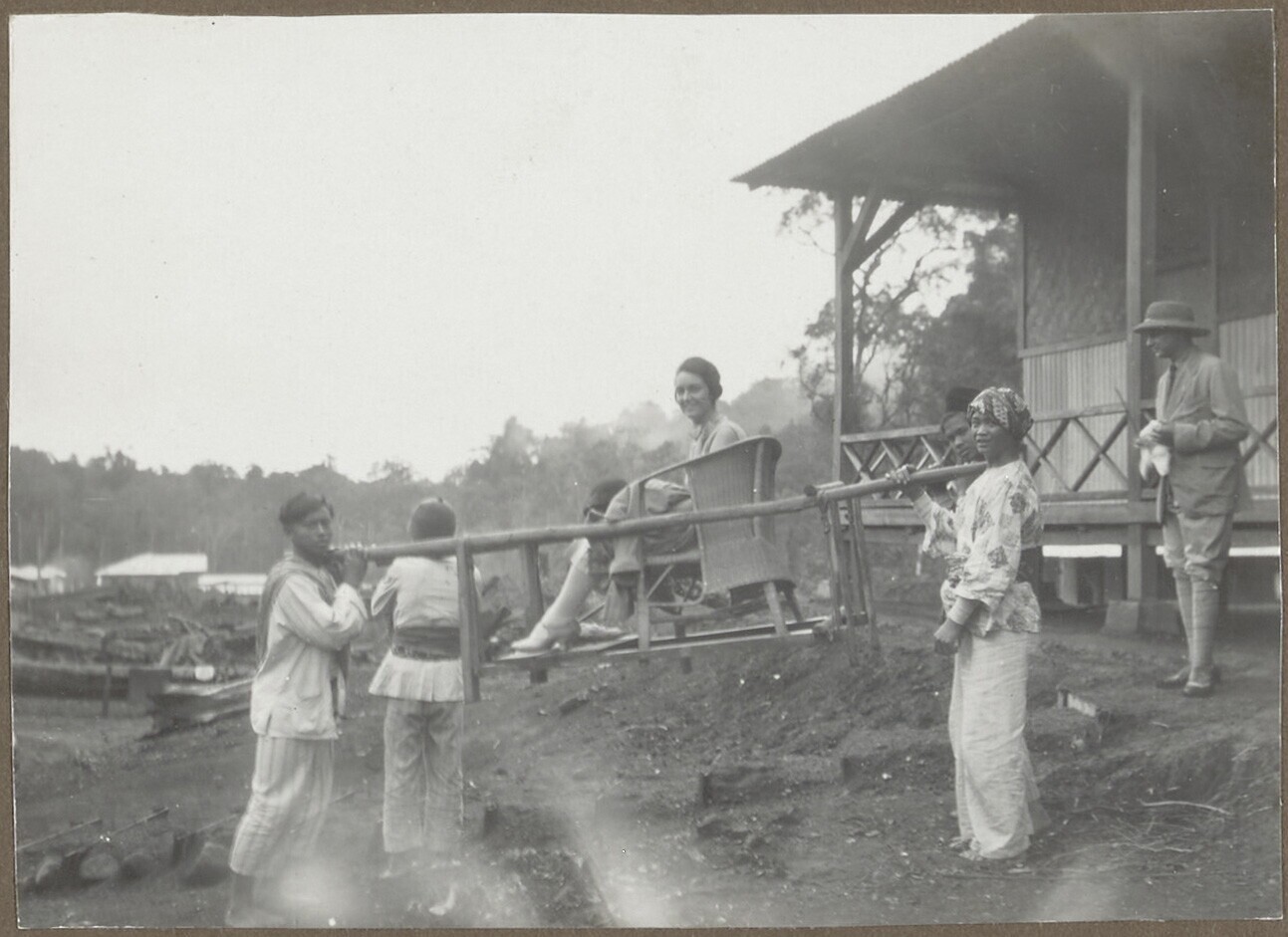 Portret van een vrouw die op een draagstoel gedragen...