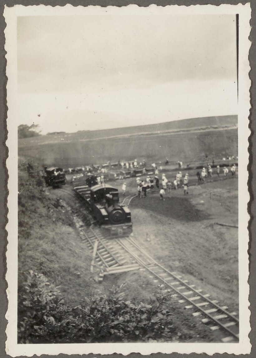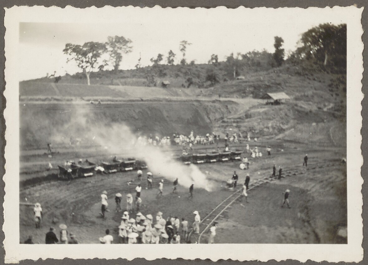Stoomtrein met karretjes en Javaanse arbeiders bezig...
