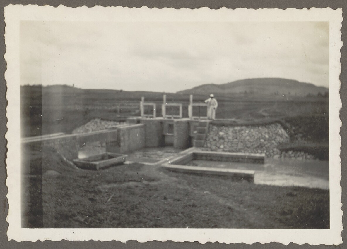 Gezicht op de bouwplaats voor de dam met waterpomp; ...