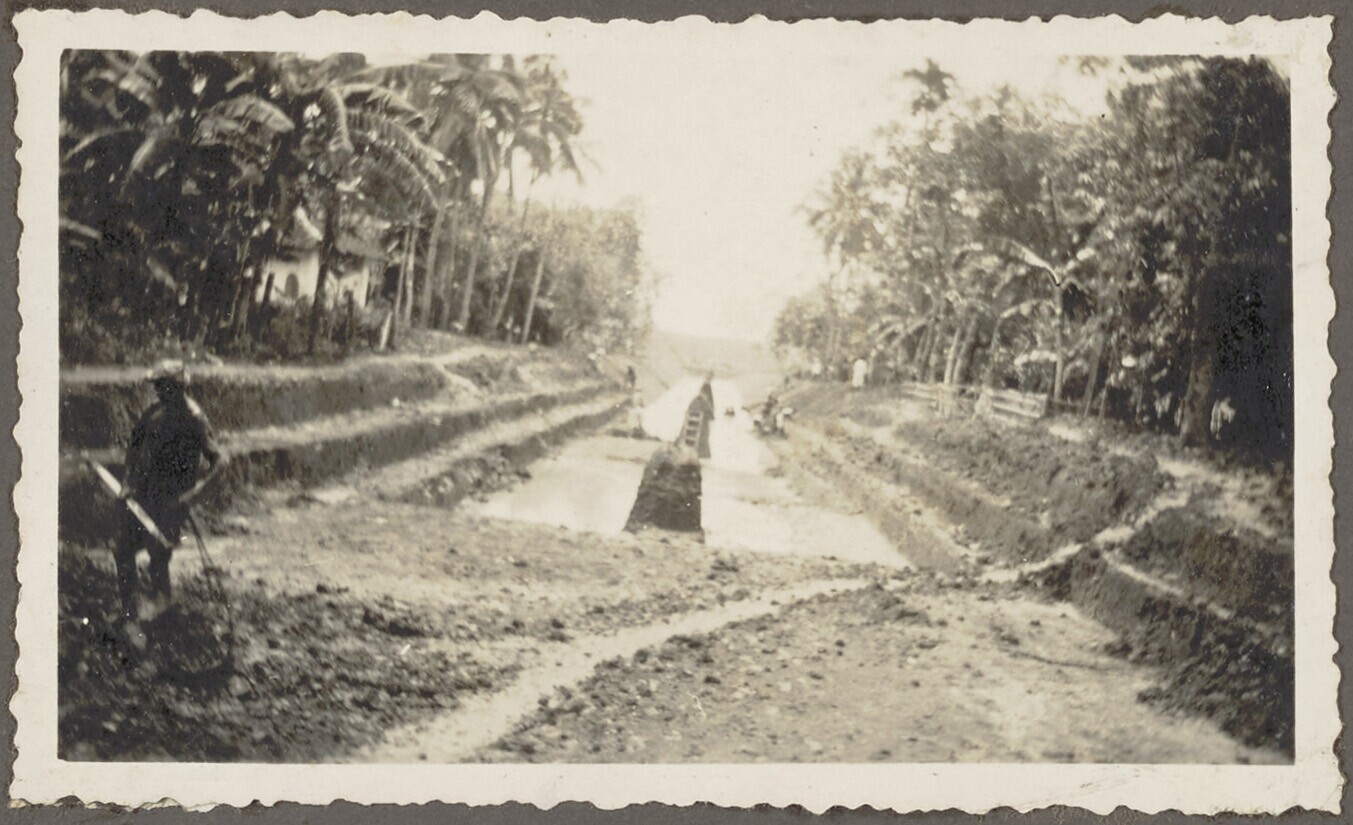 Javaanse arbeiders bezig met het ophogen bij de damteen