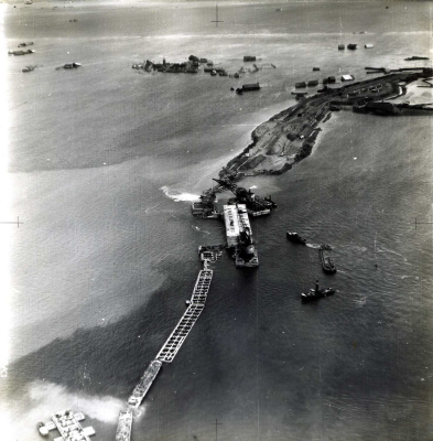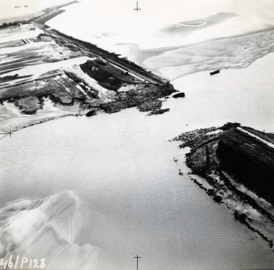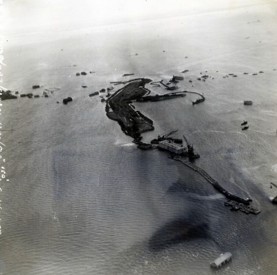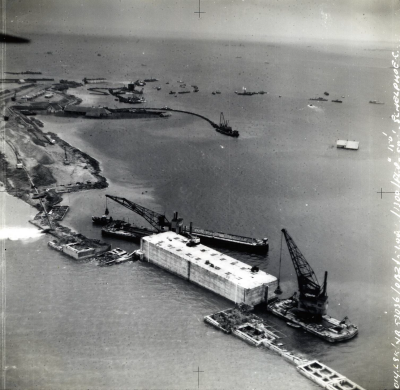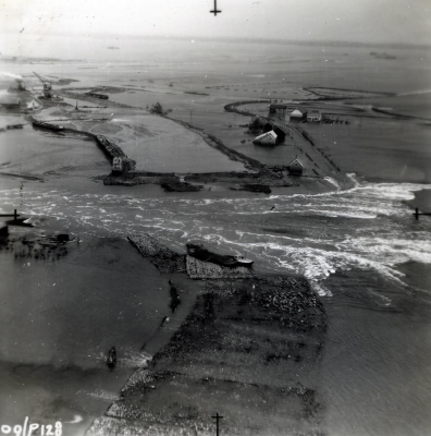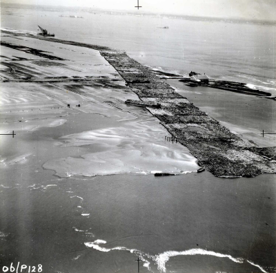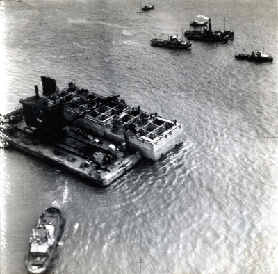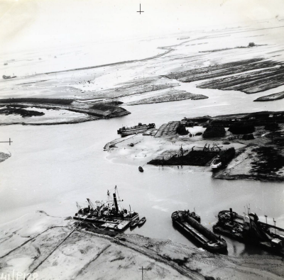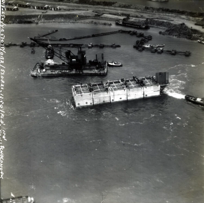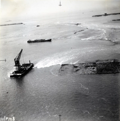 Luchtfoto van sluiting van een dijkgat met caissons ...