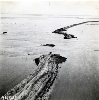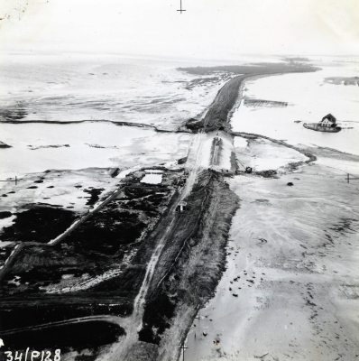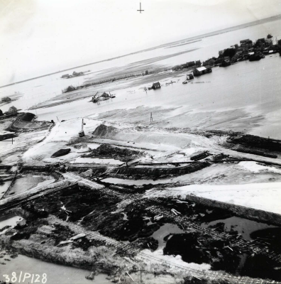 Luchtfoto van herstel van dijken na de Watersnood va...