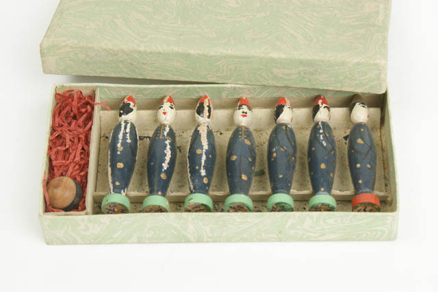 Miniatuur kegelspel met 7 kegels in vorm van clown e...