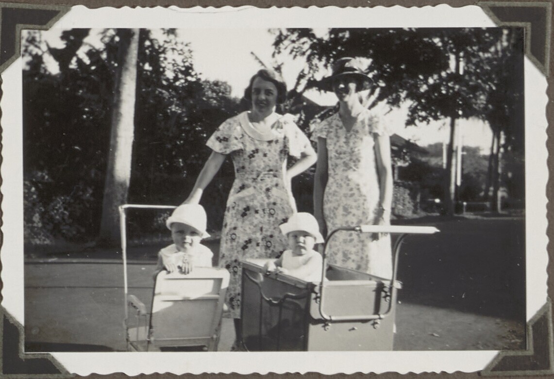 Portret van twee vrouwen met twee baby's in kinderwa...