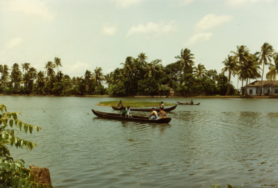 Bootjes op een rivier in Kuttanad, India.