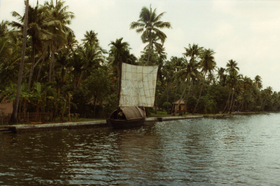 Zeilbootje op een rivier in Kuttanad, India.
