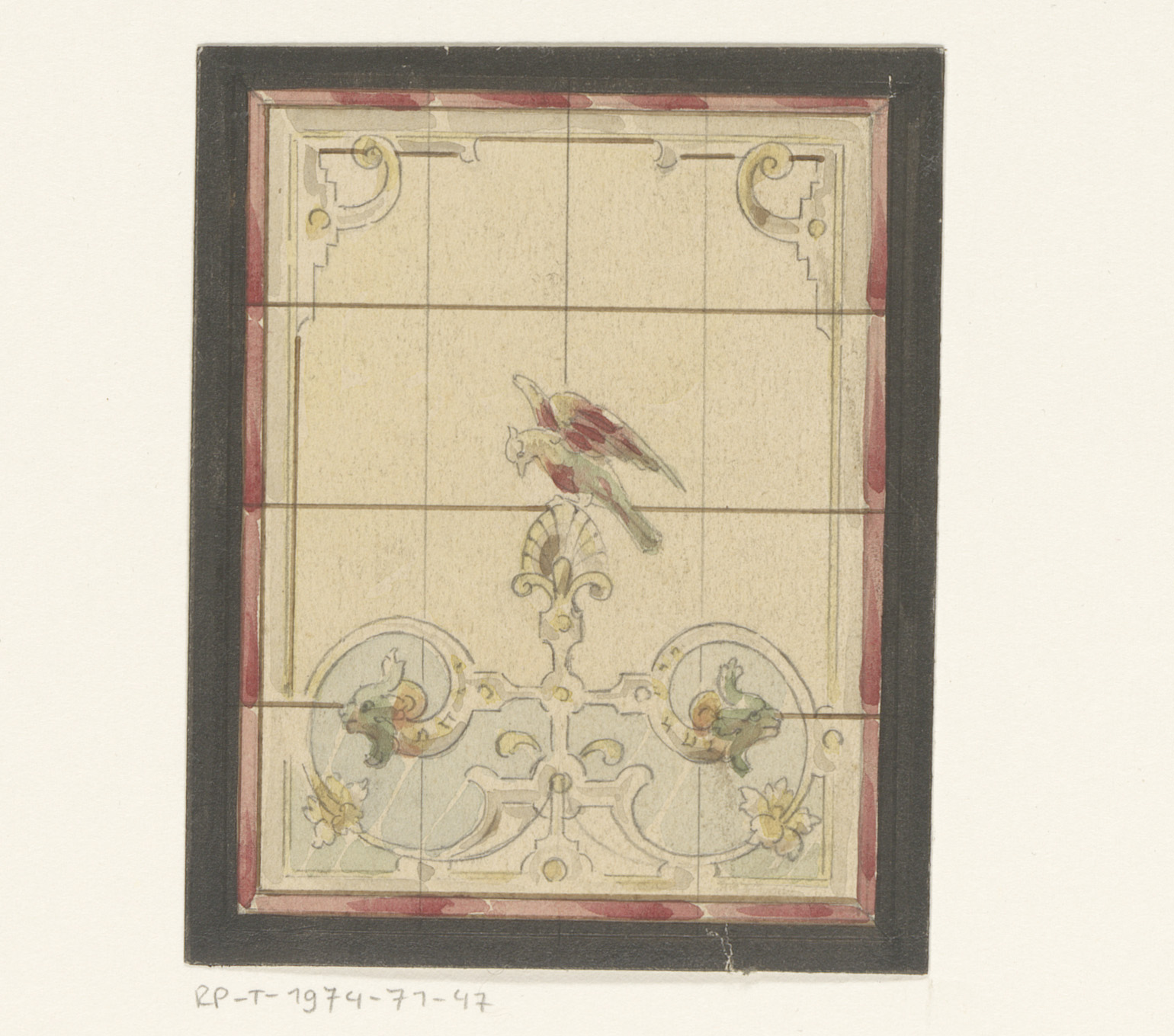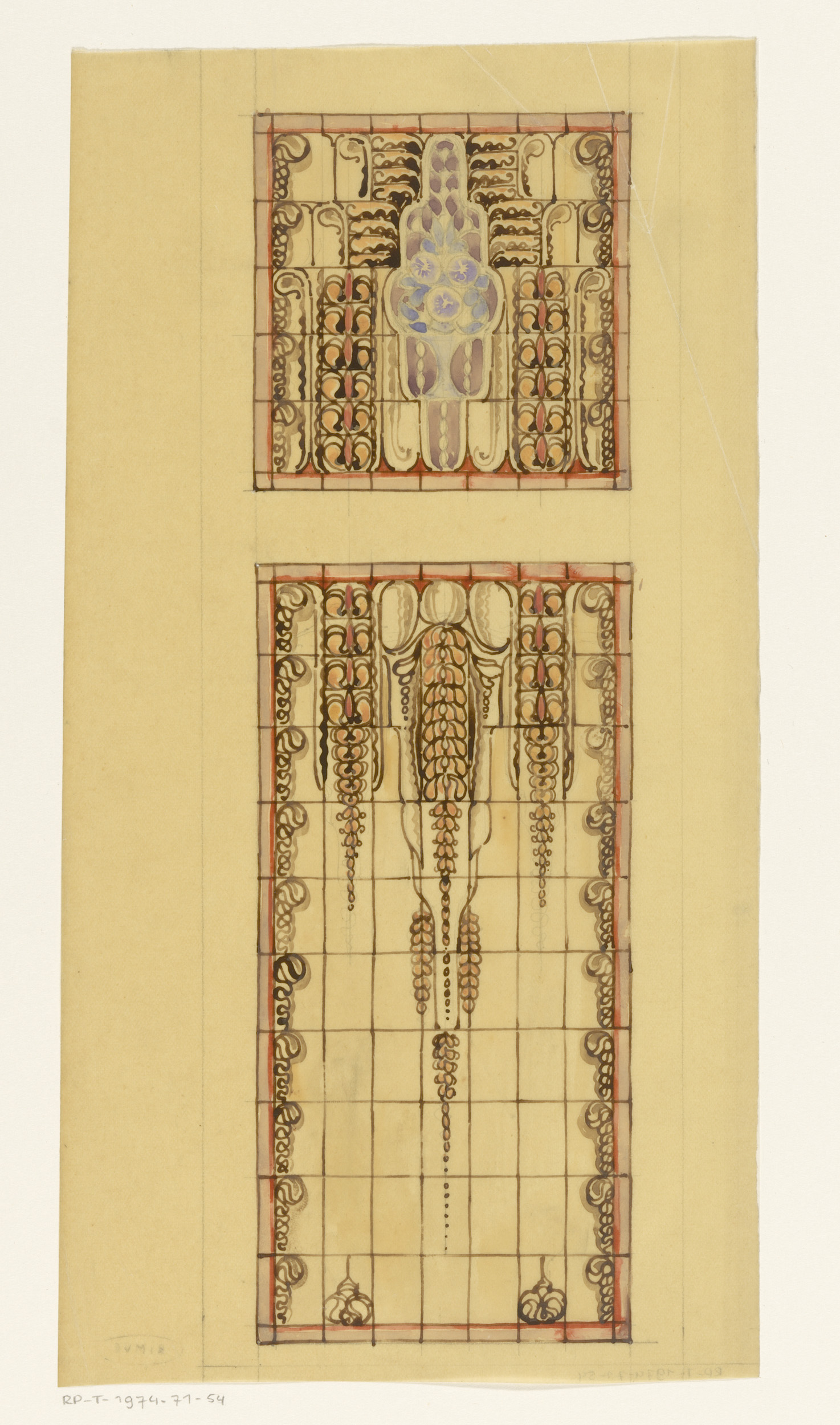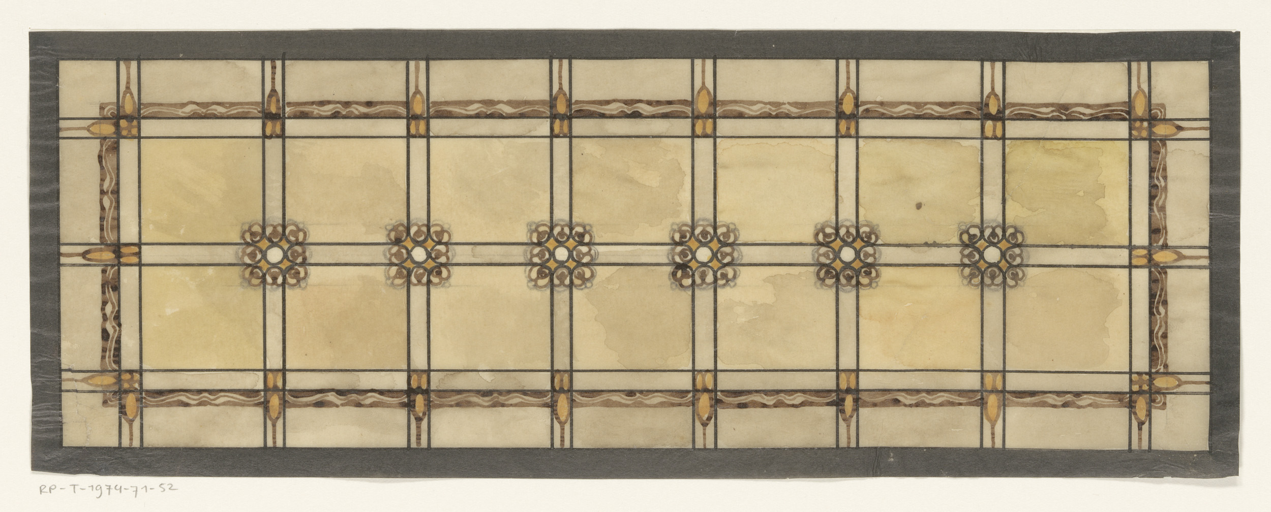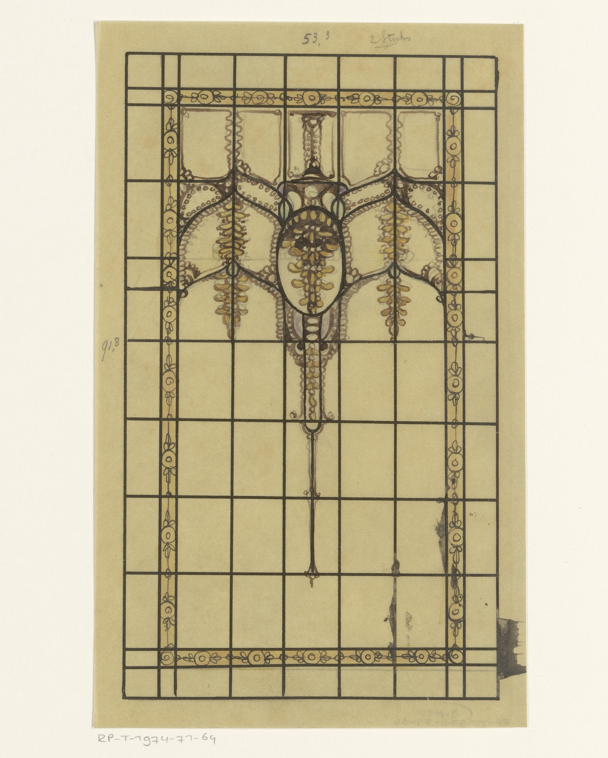 Ontwerp voor een glas in loodraam met ornamenten en ...