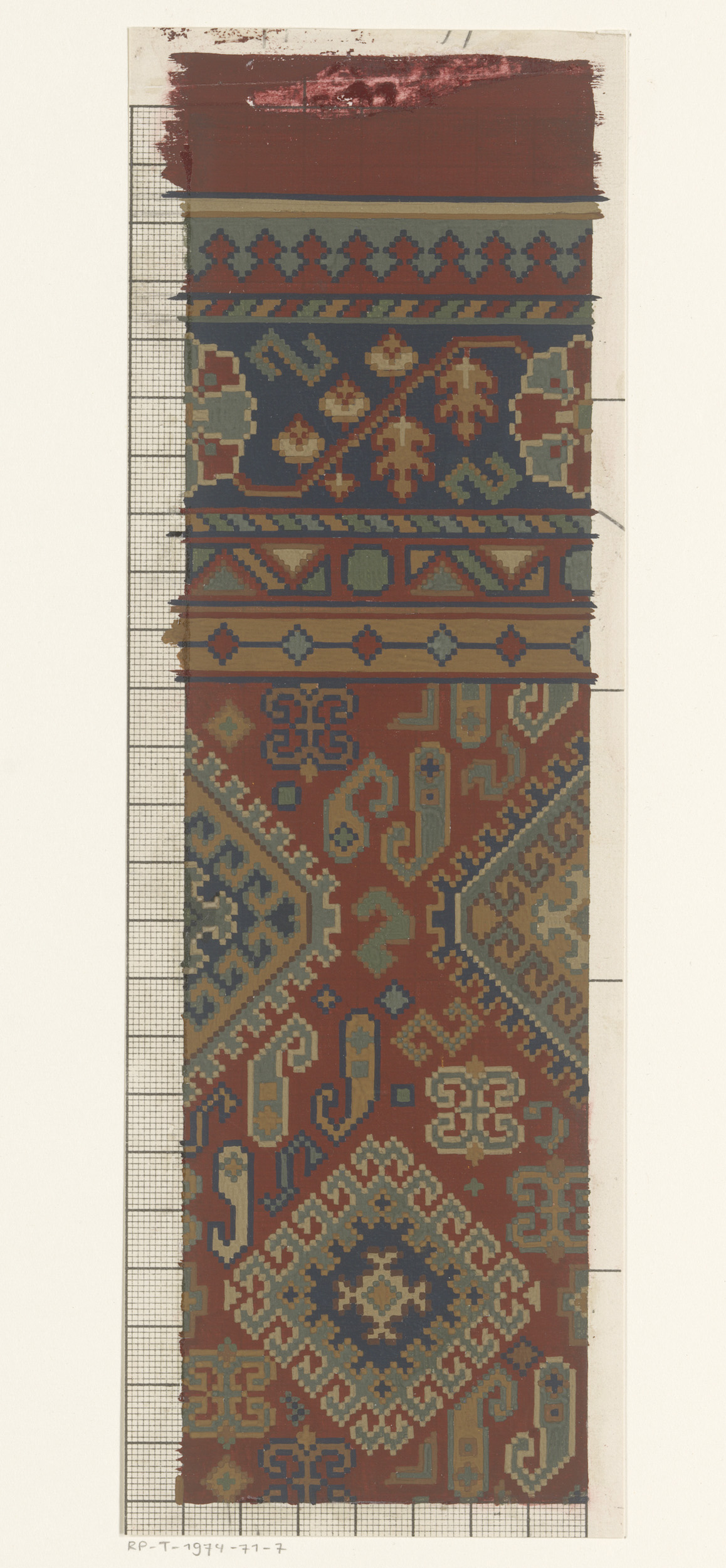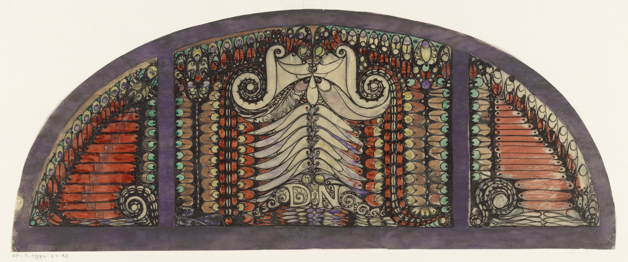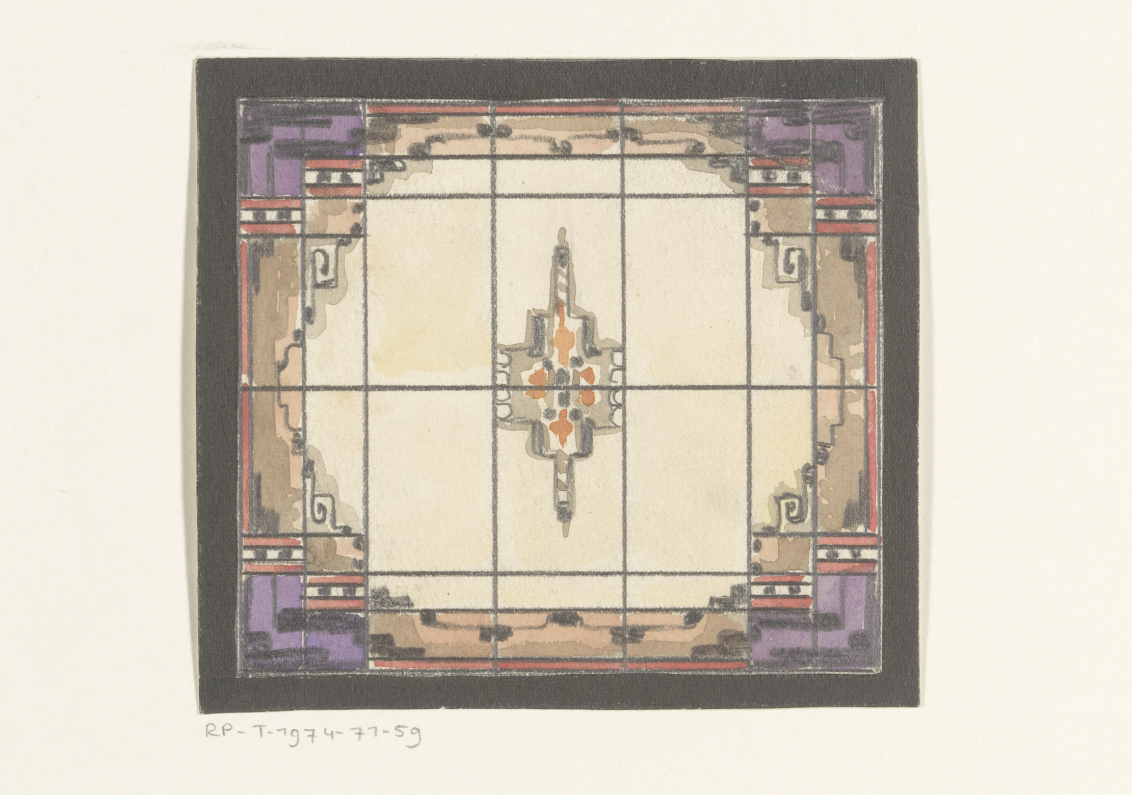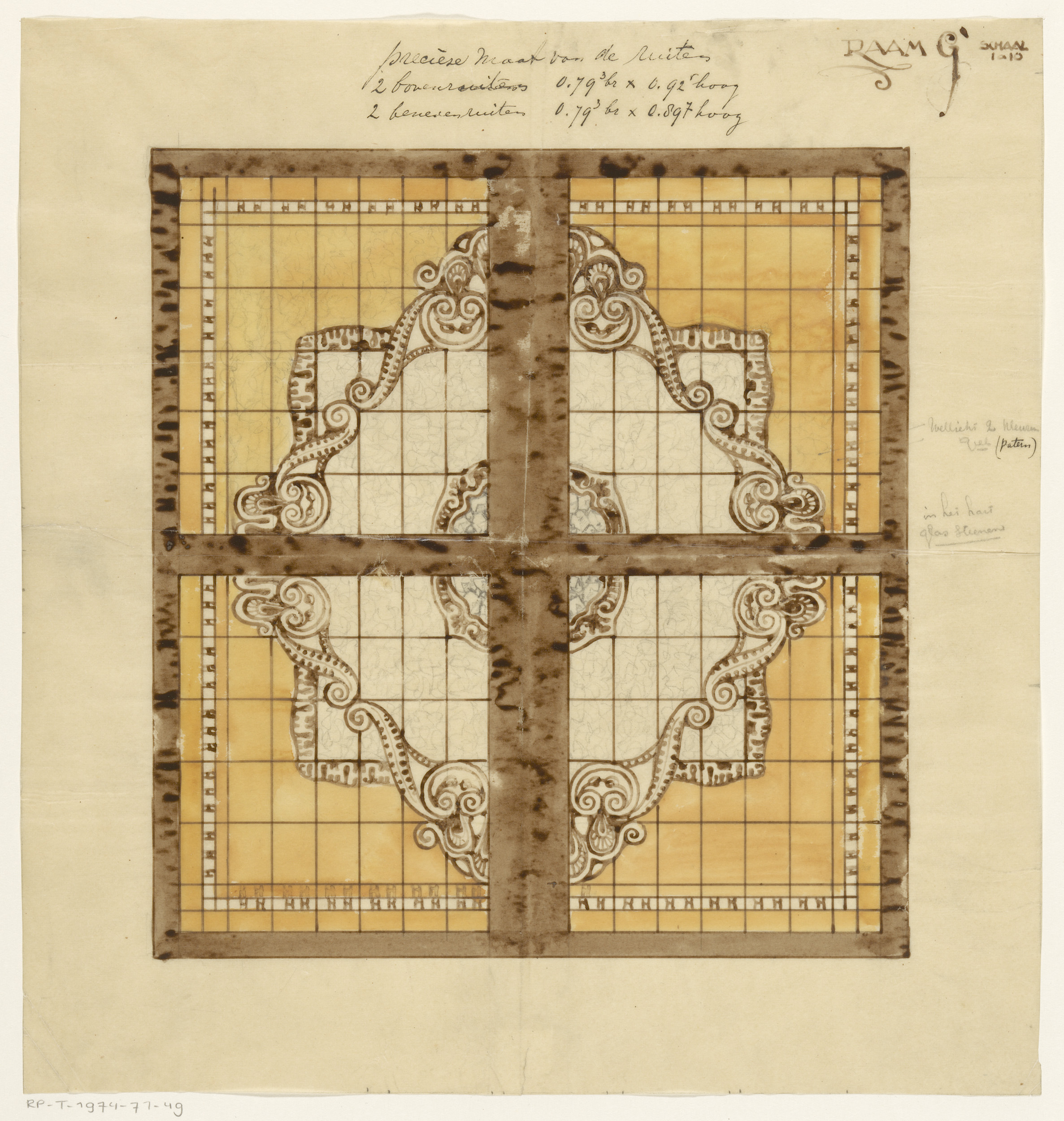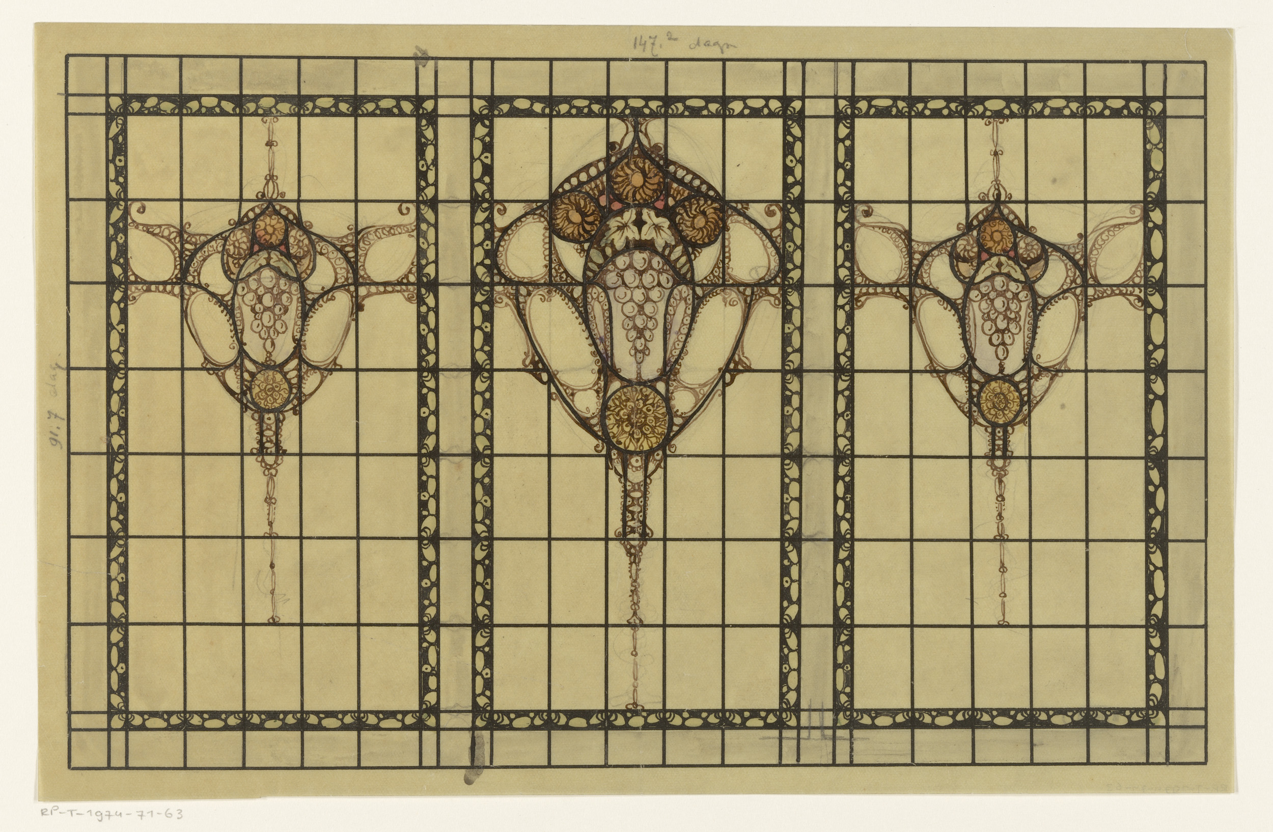 Ontwerp voor een glas in loodraam met ornamenten en ...