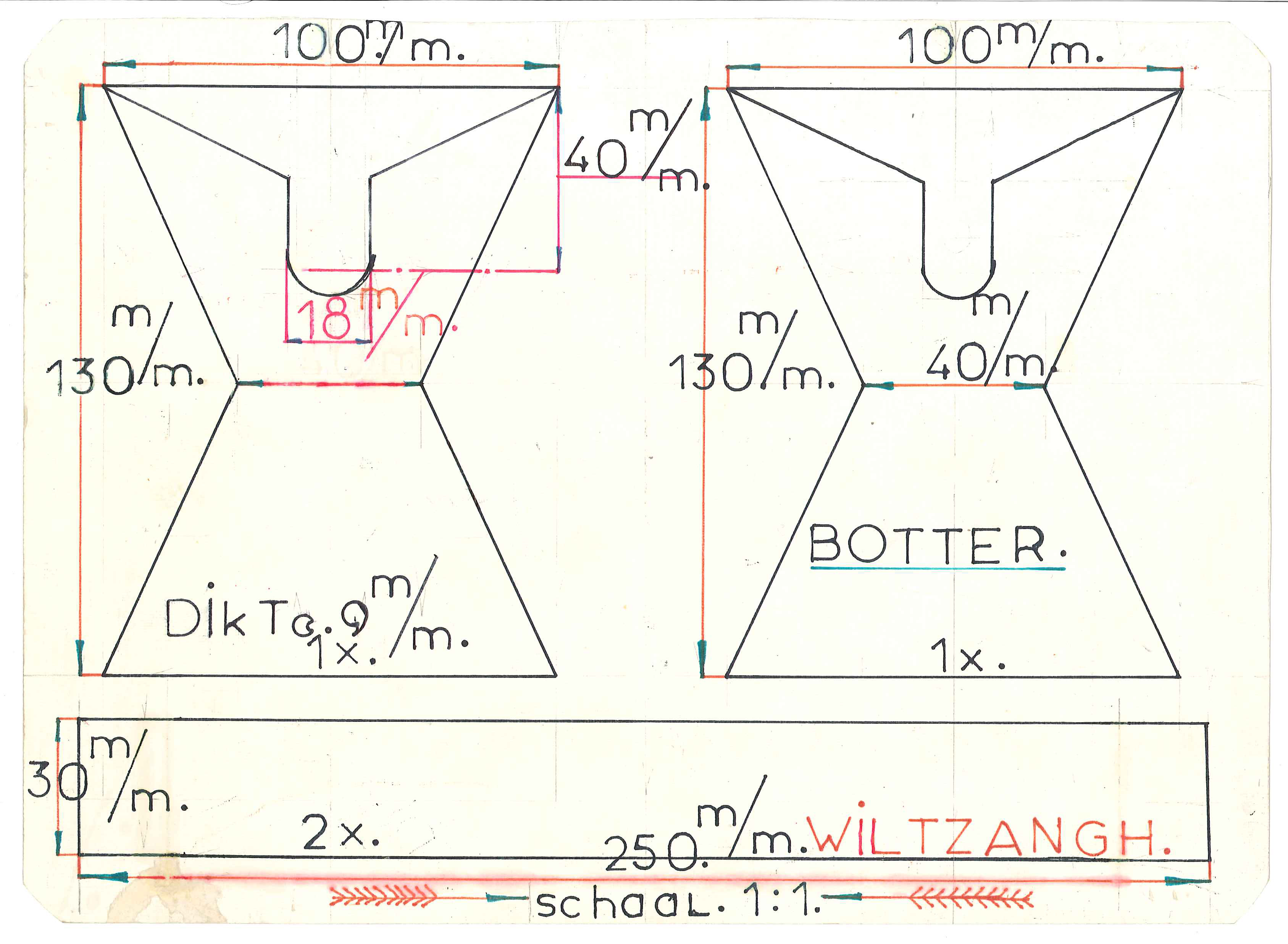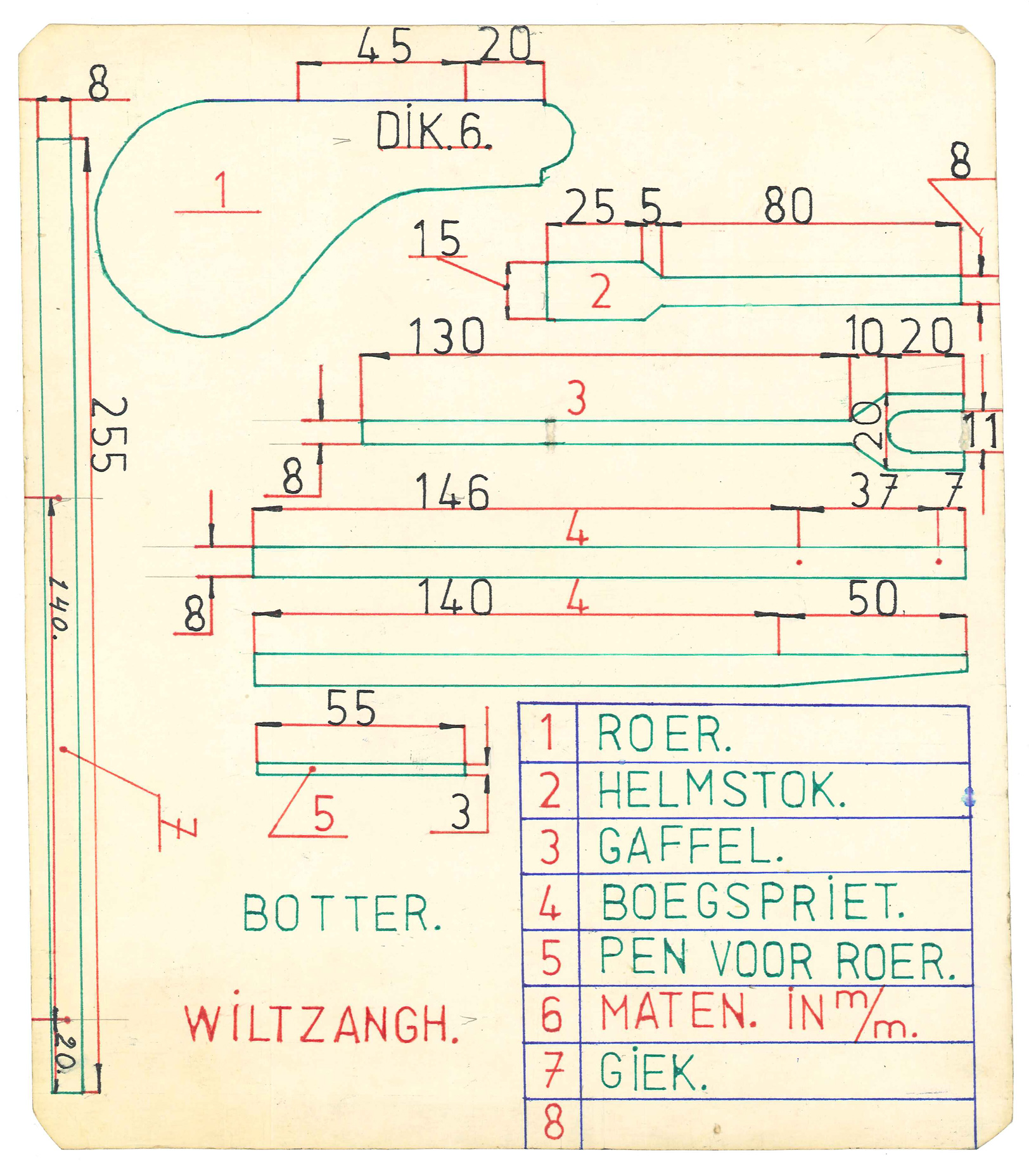 Bouwtekening voor onderdelen van modelboot, type botter