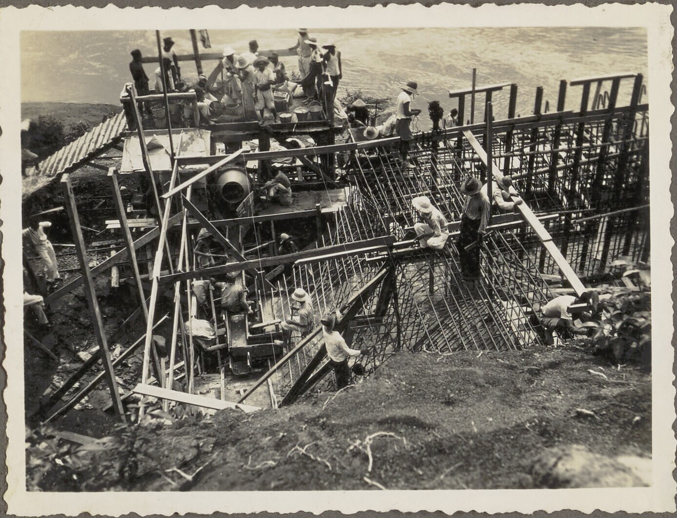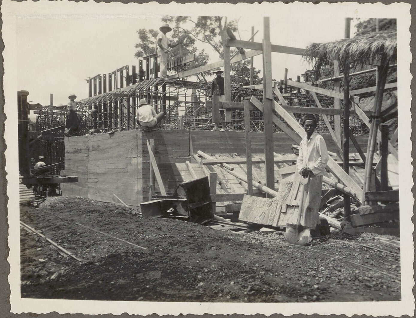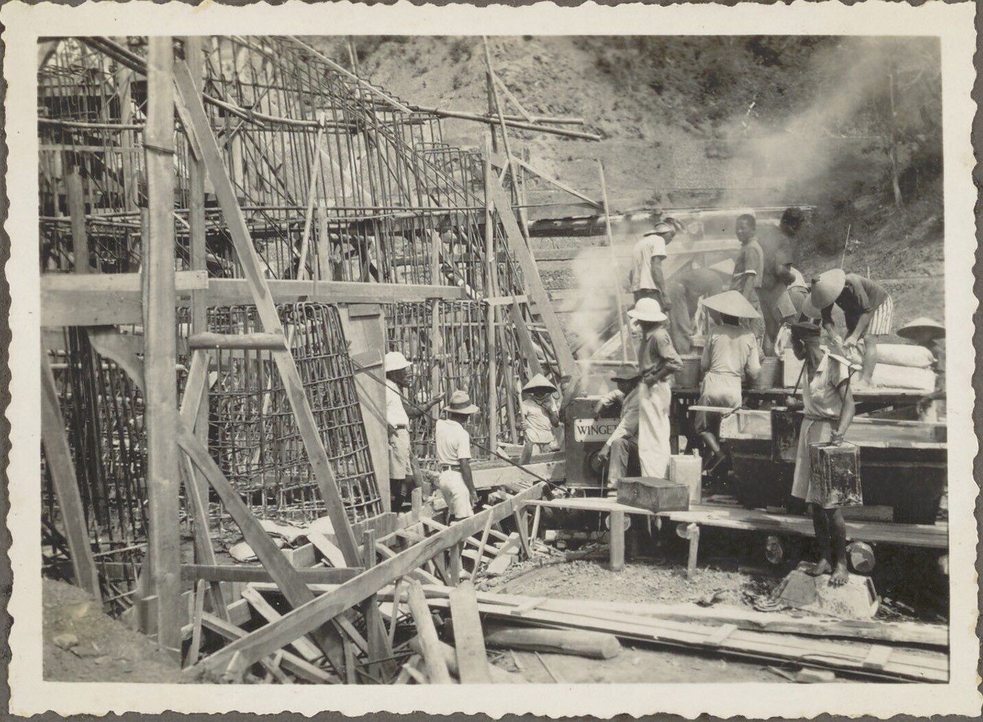 De Javaanse arbeiders storten het beton in de vakken...