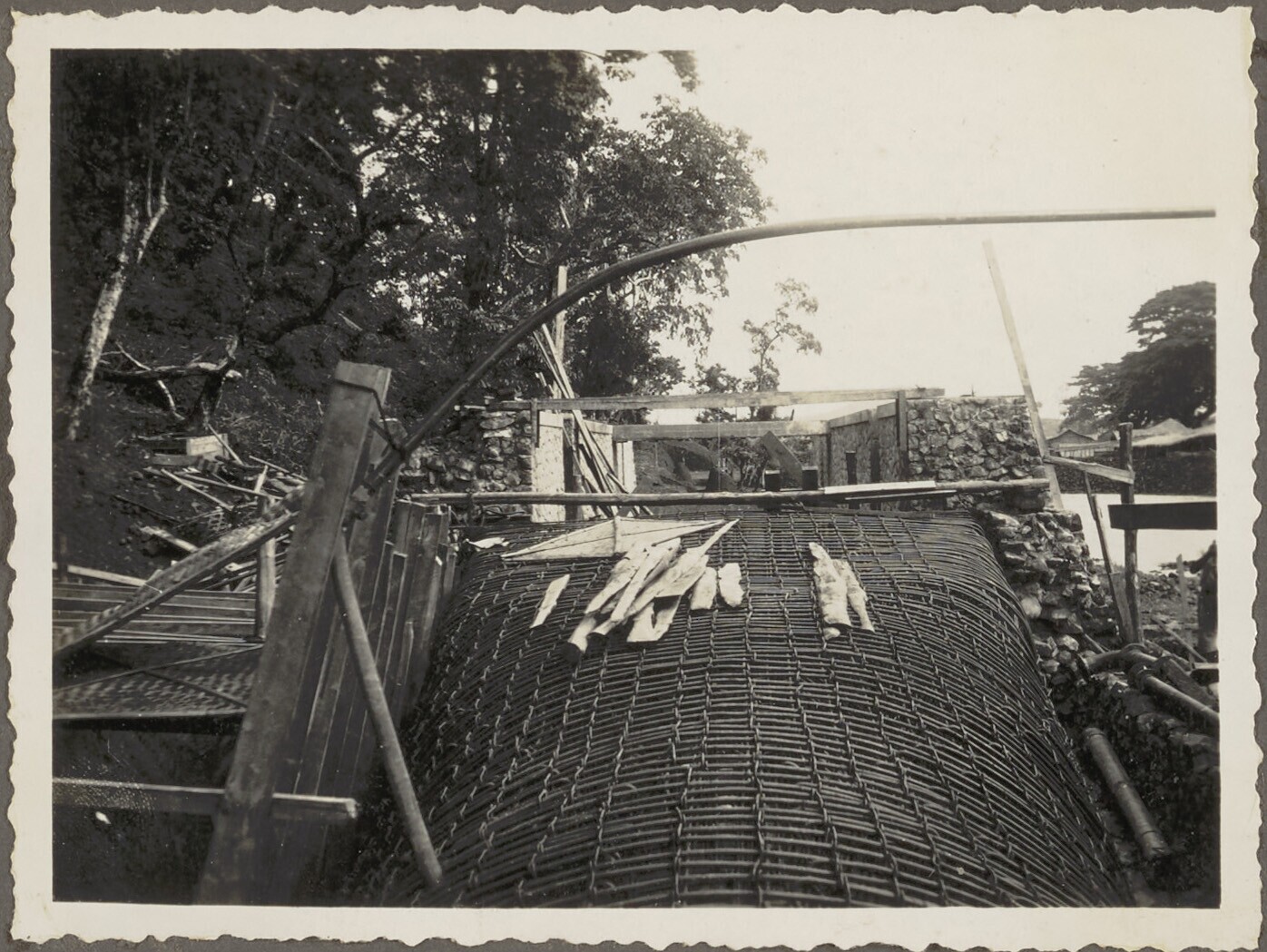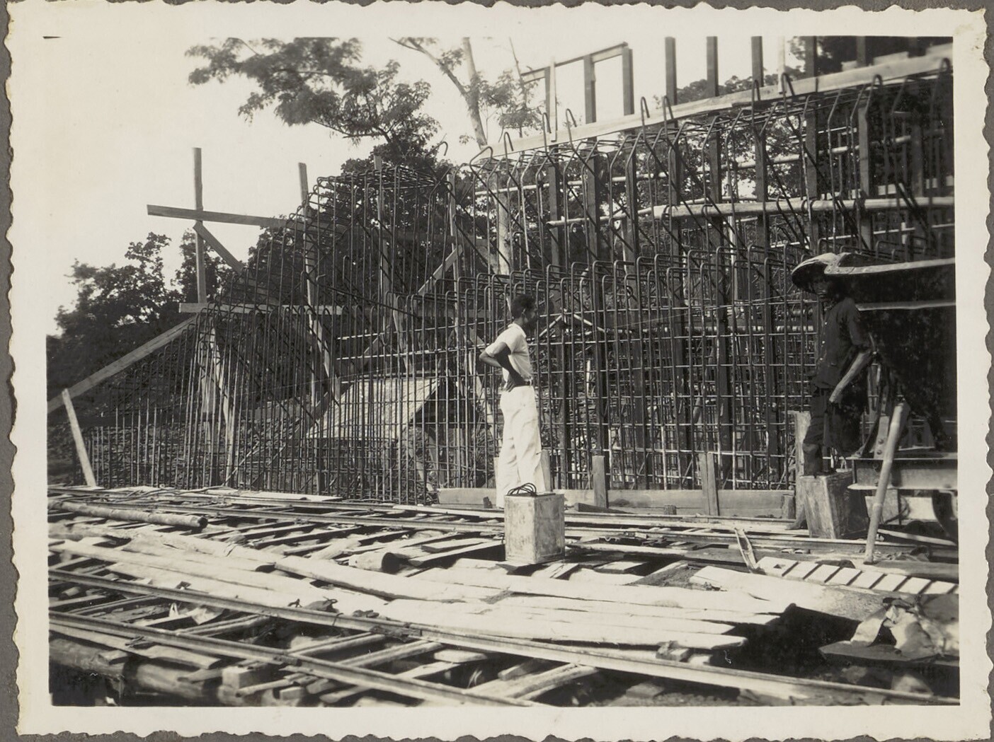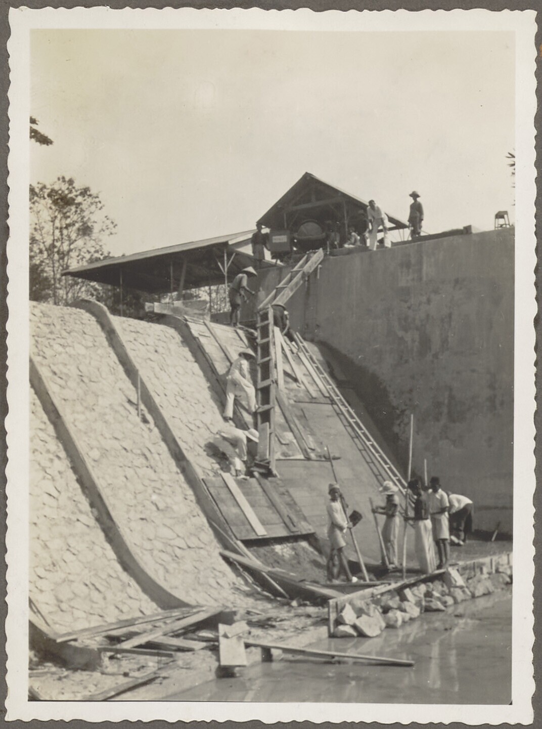 De Javaanse arbeiders storten het beton in de vakken...