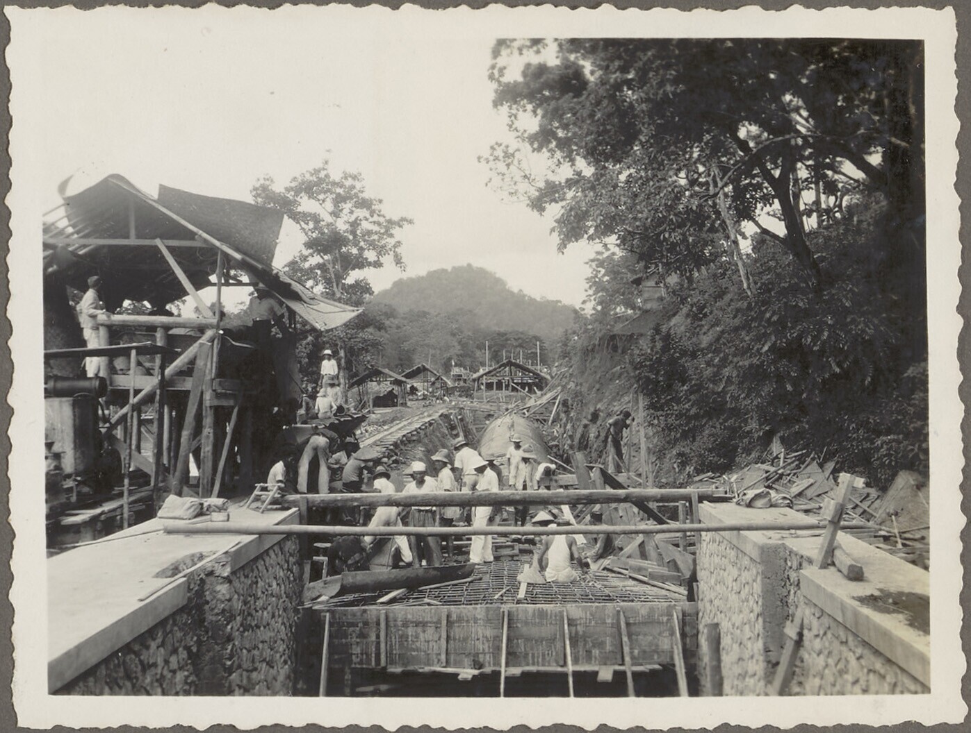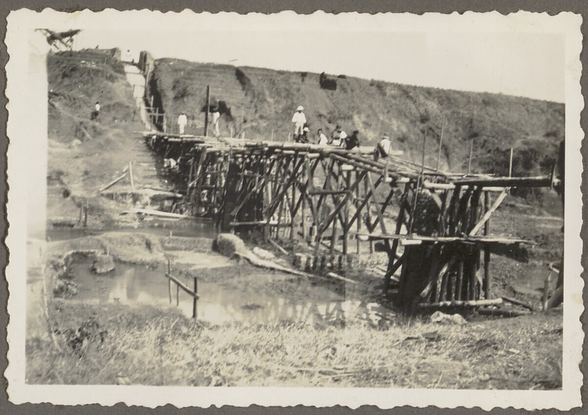 Javaanse arbeiders aan het werk bij de werkbrug over...