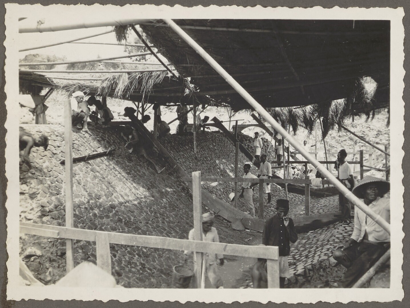 De Javaanse arbeiders bezig met het metselwerk voor ...