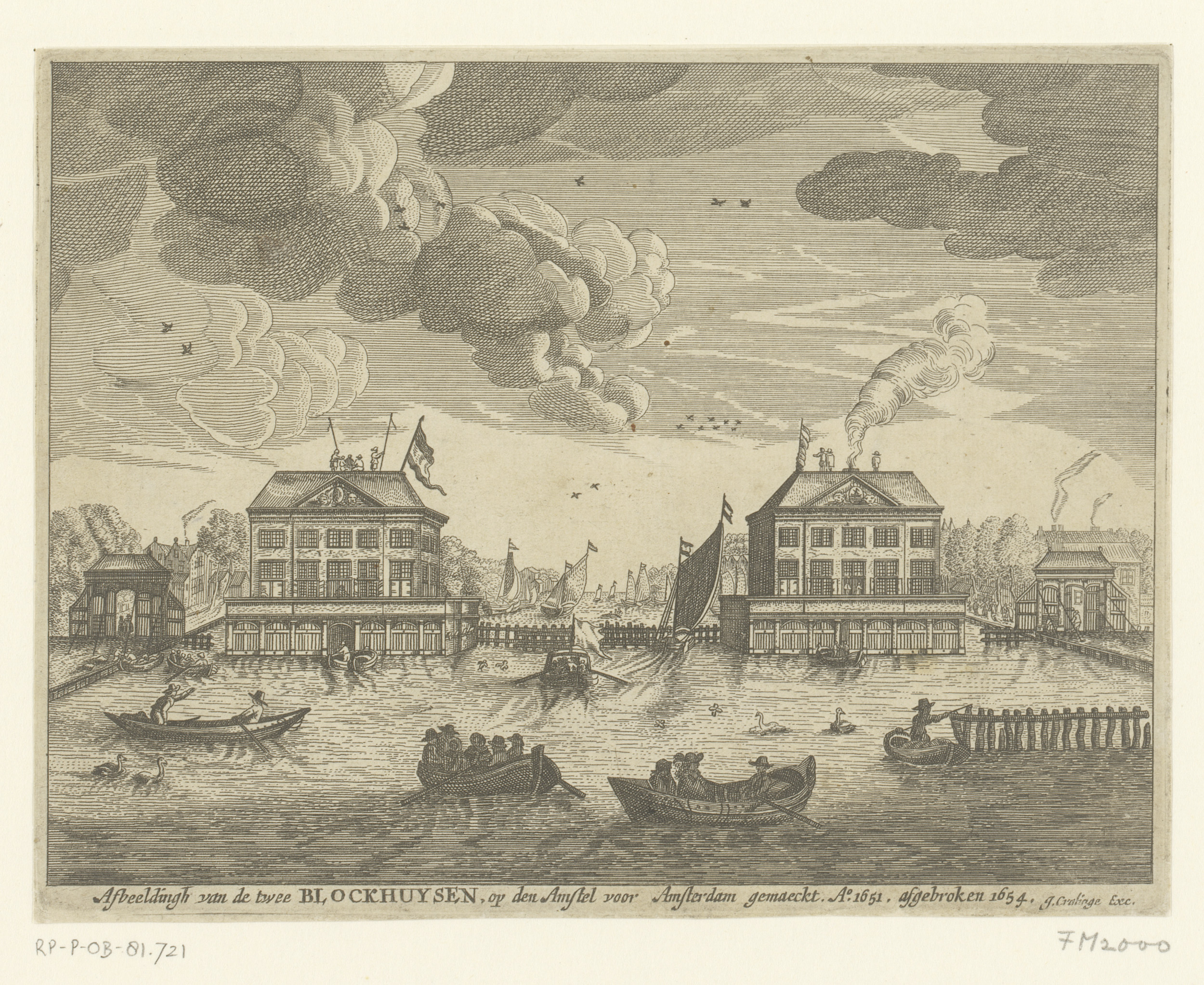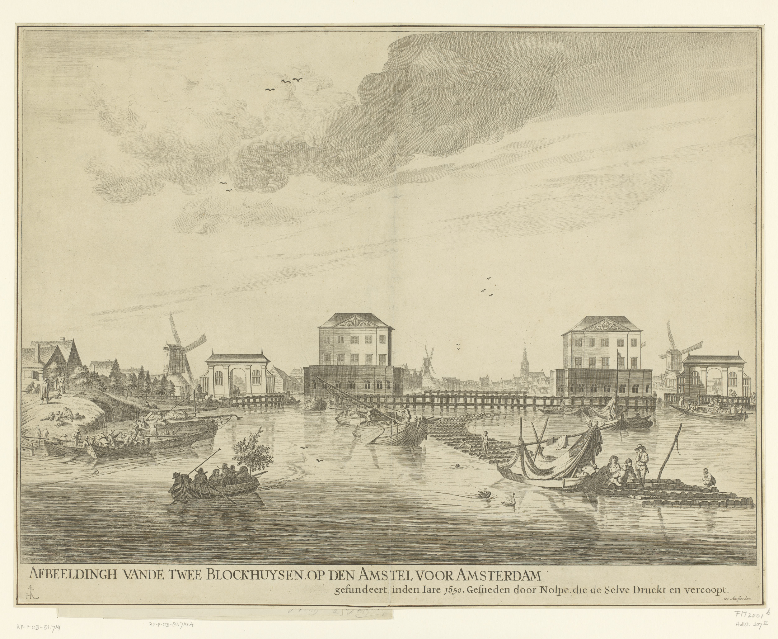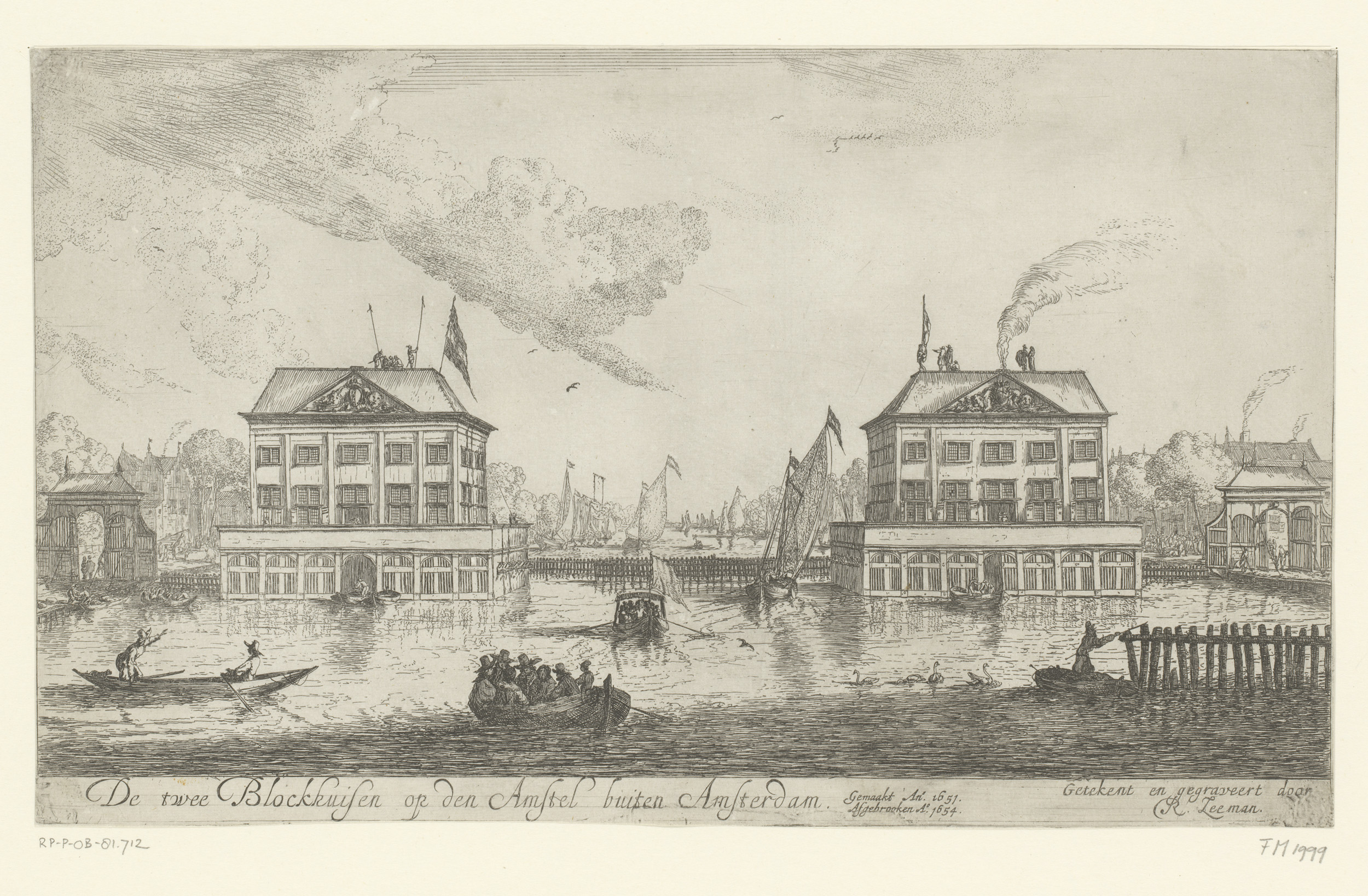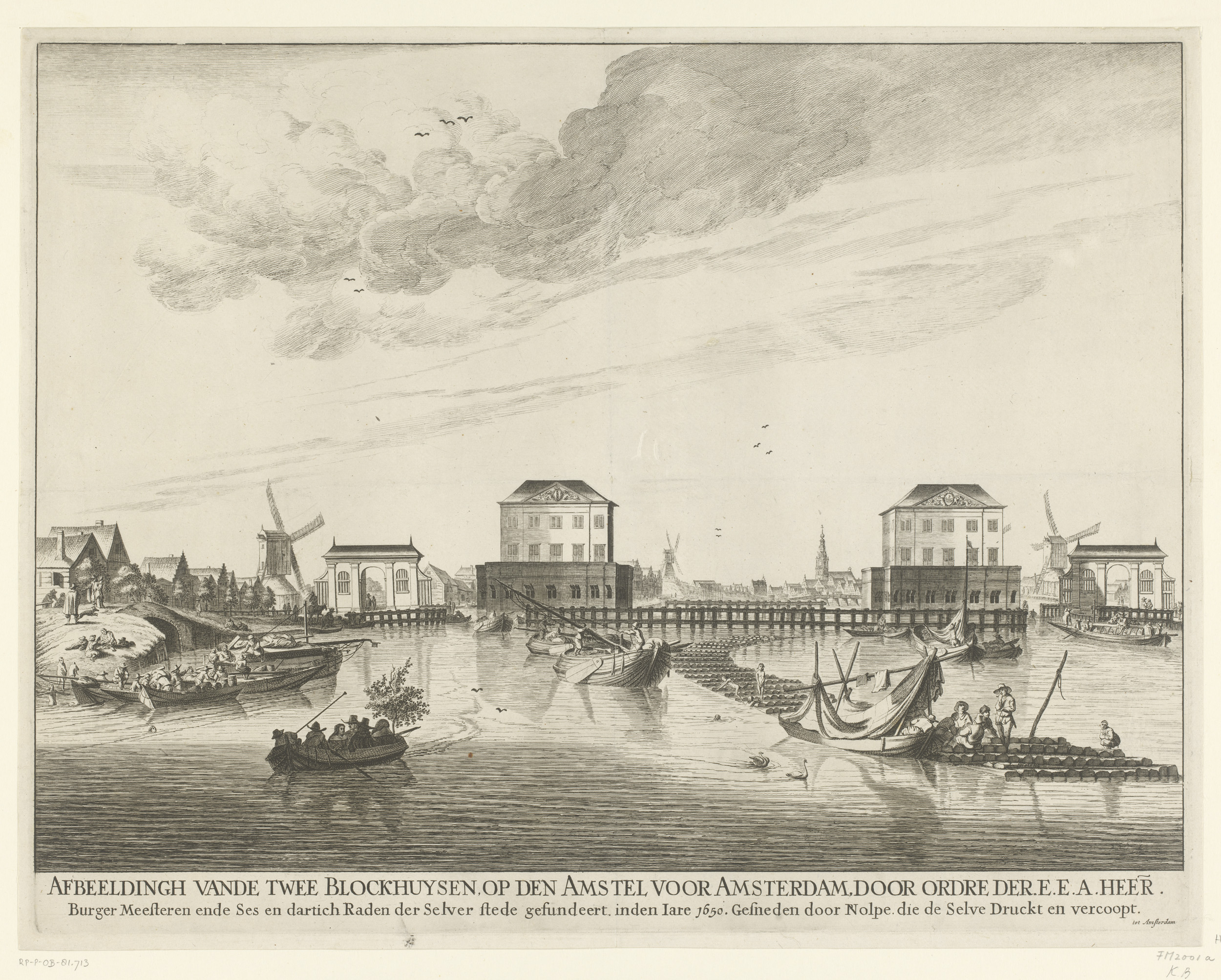 Gezicht op de twee Blokhuizen in de Amstel, 1651-1654