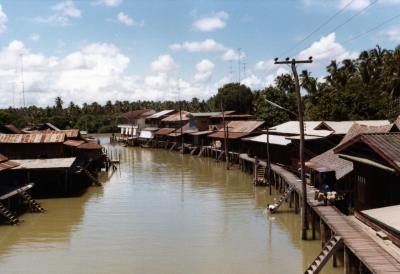 Palendorp langs een rivier in Thailand, 1980.