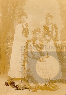 Drie vrouwen in lange japonnen en bloemslingers om d...
