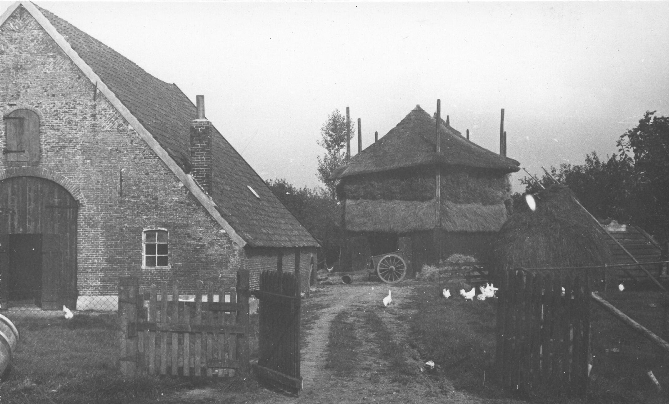Boerenerf met schuur en hooibergen, Rhenen, 1936 (zw...
